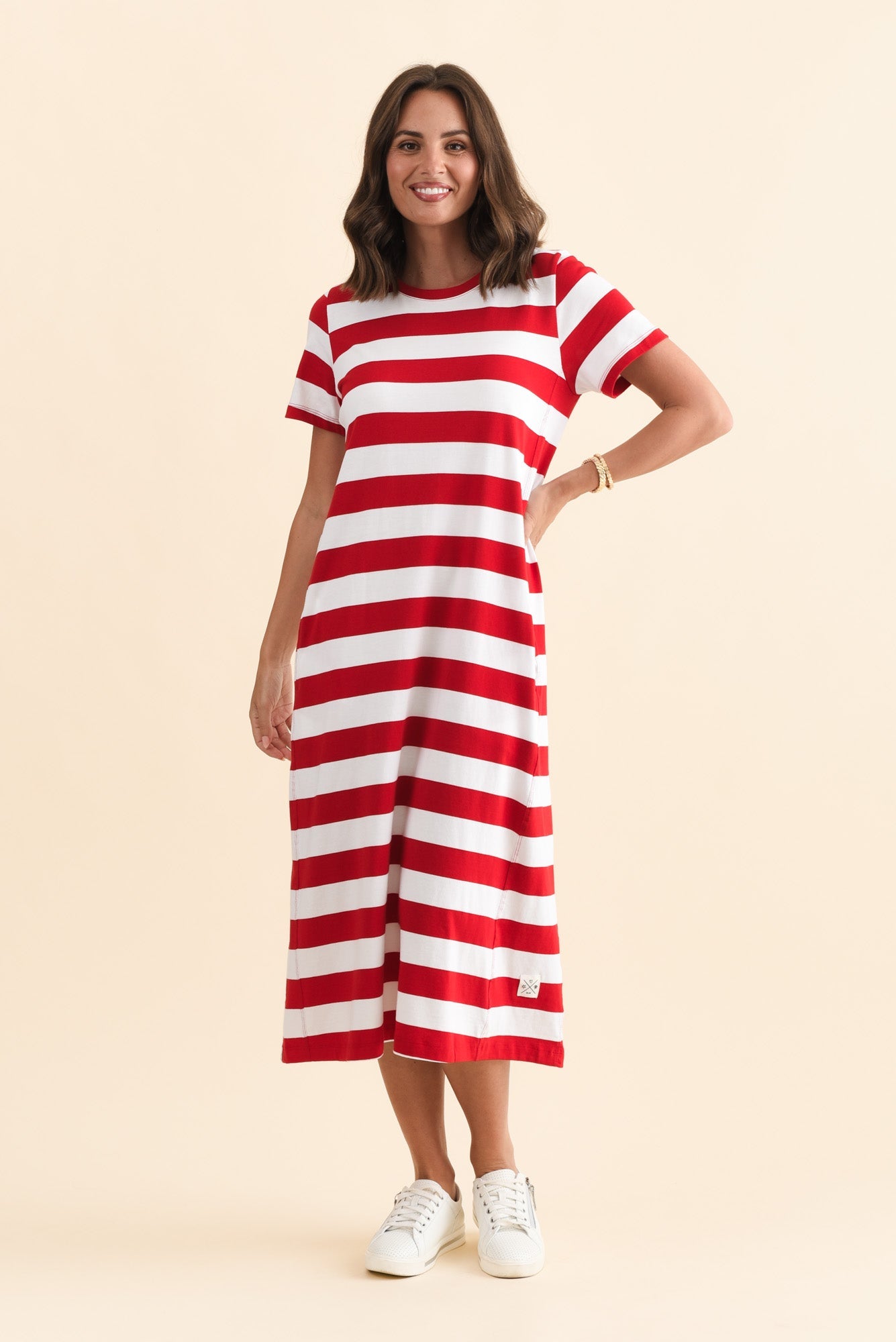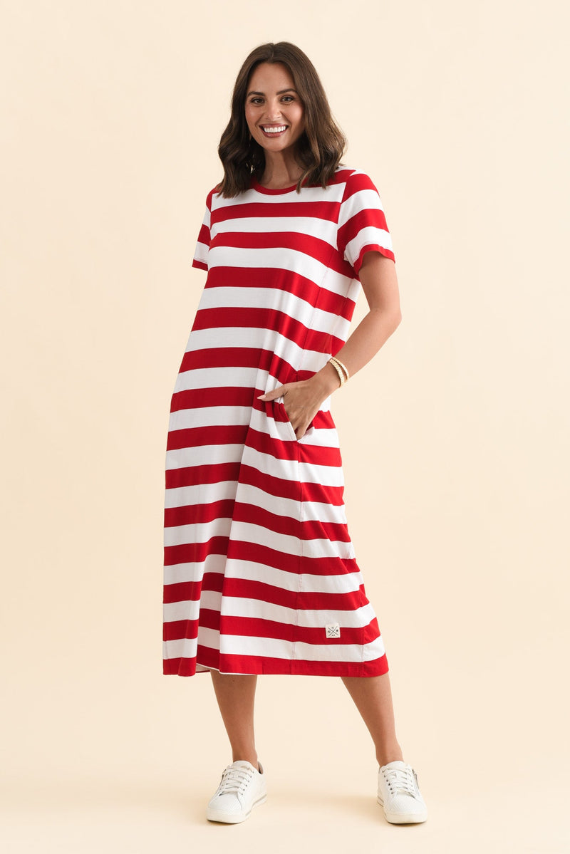 ADIRA RED STRIPE COTTON POCKET DRESS
