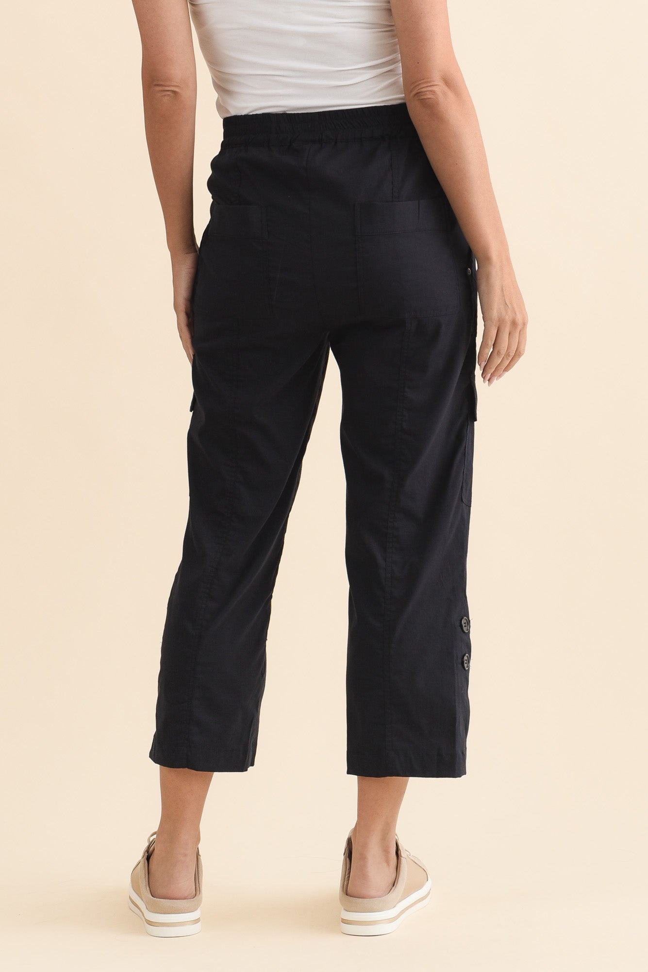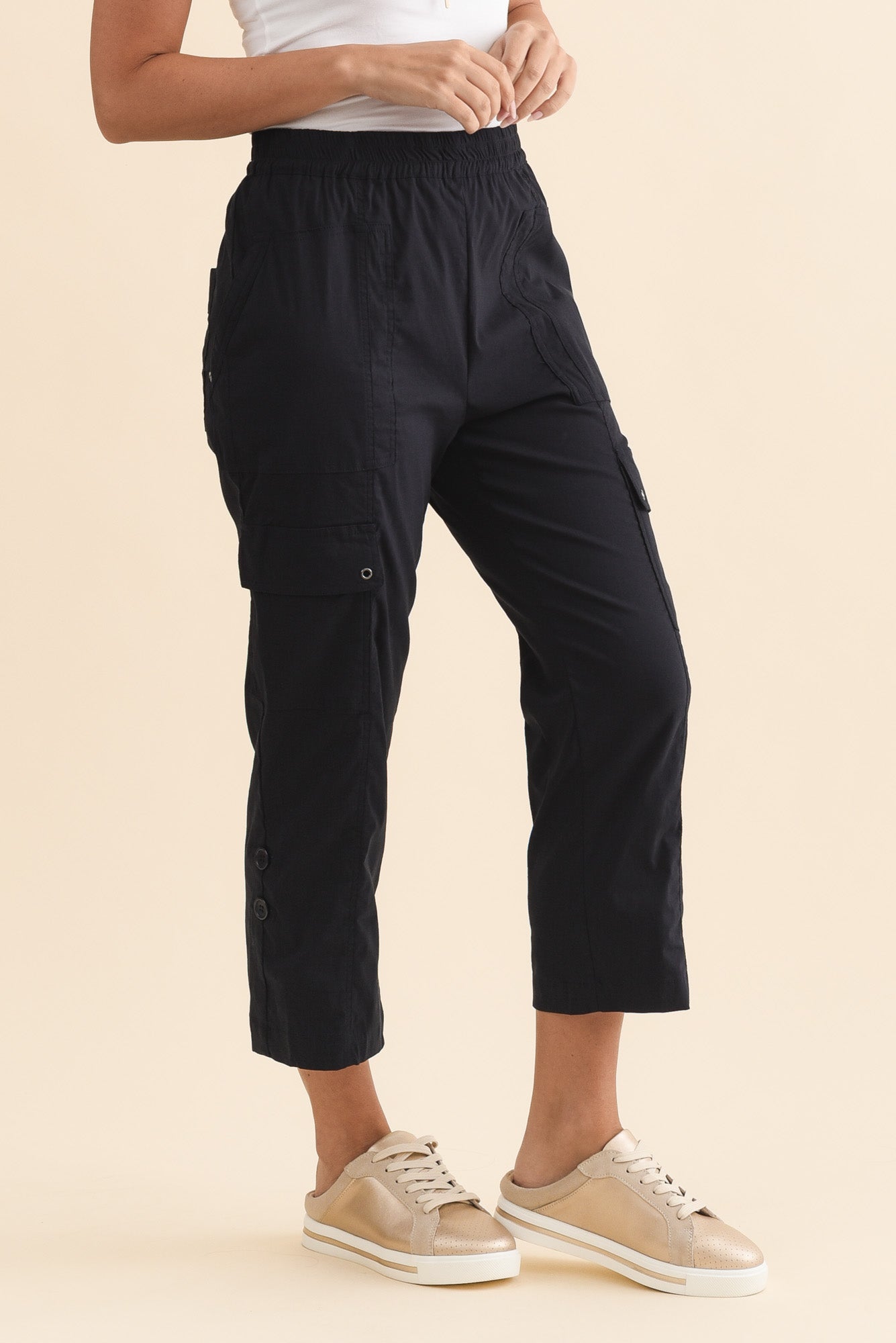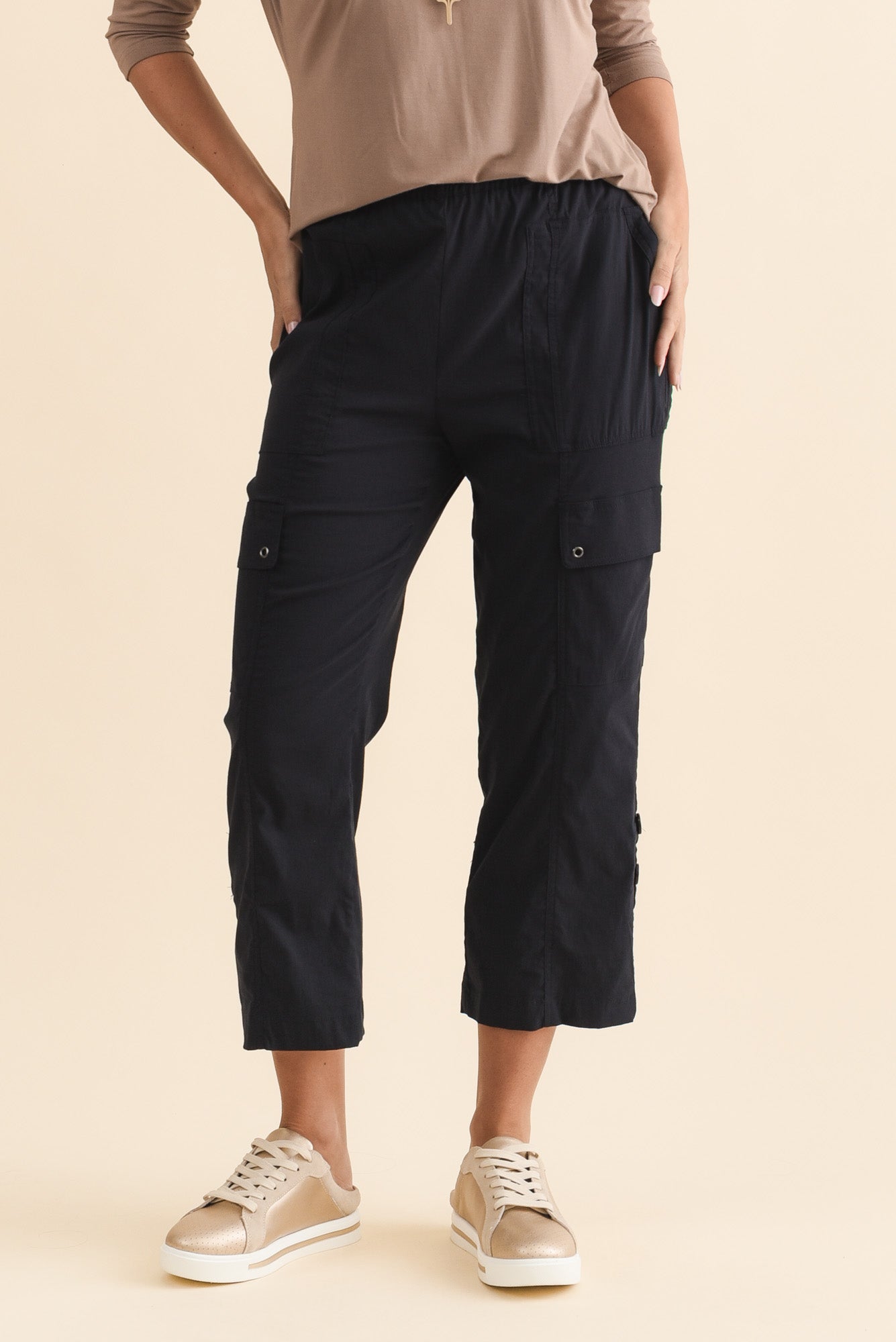 Two side pockets and two cargo-style leg pockets offer a trendy yet practical touch