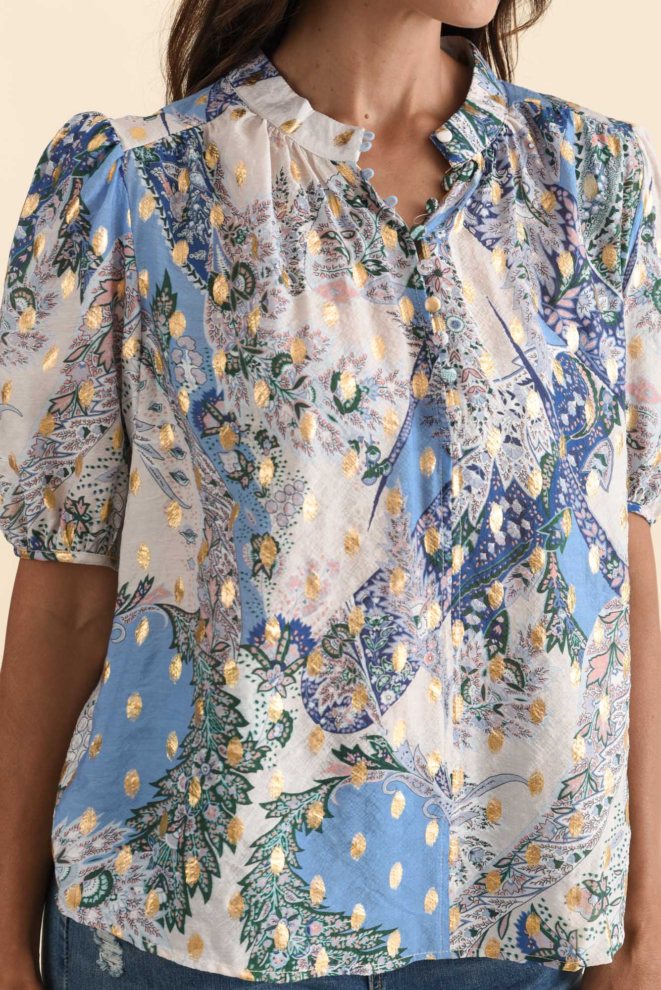 ALEXANDRA BLUE ABSTRACT BUTTON TOP