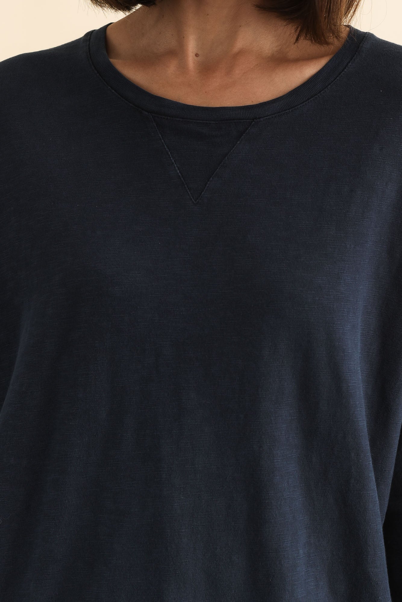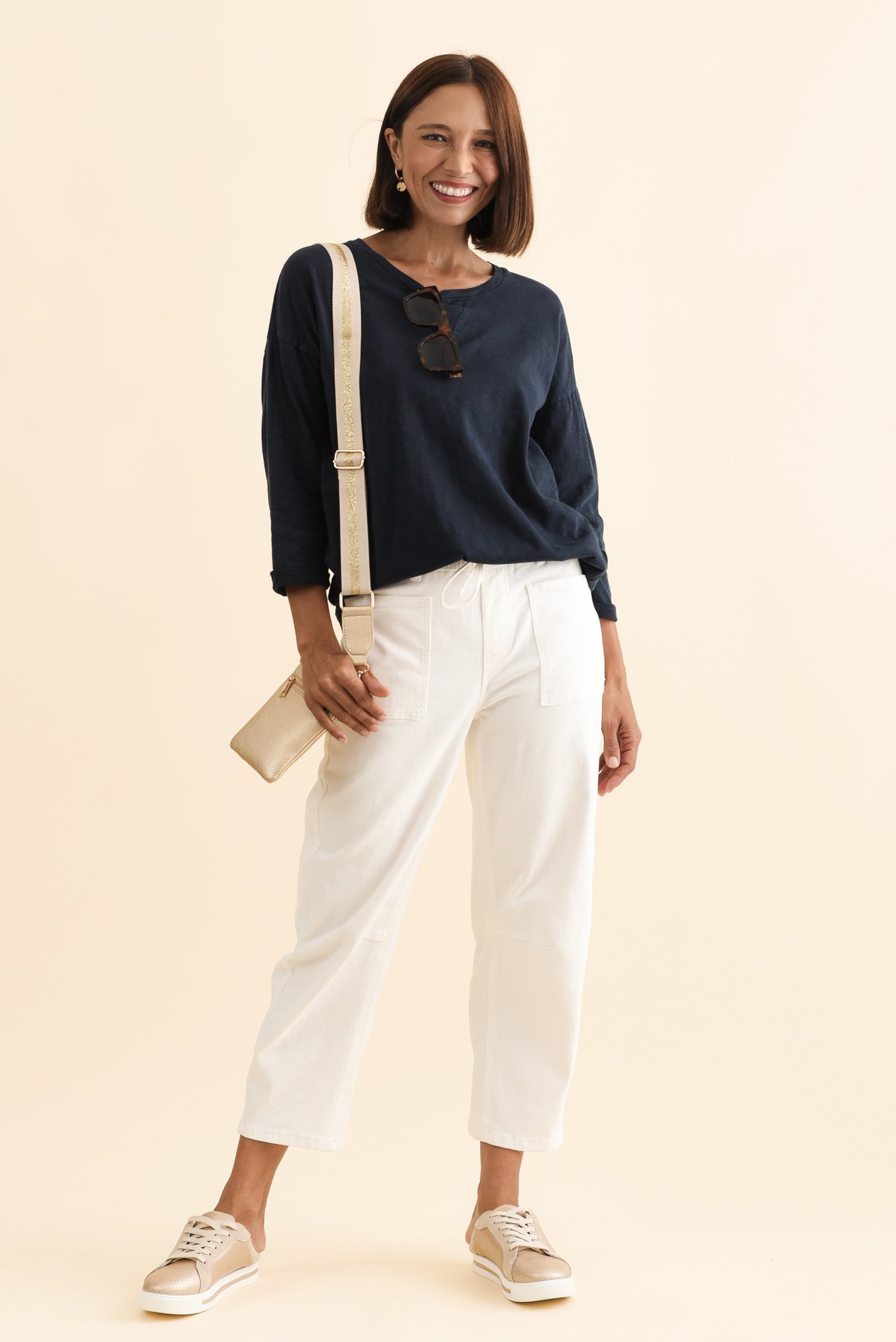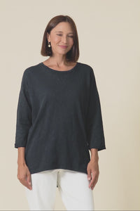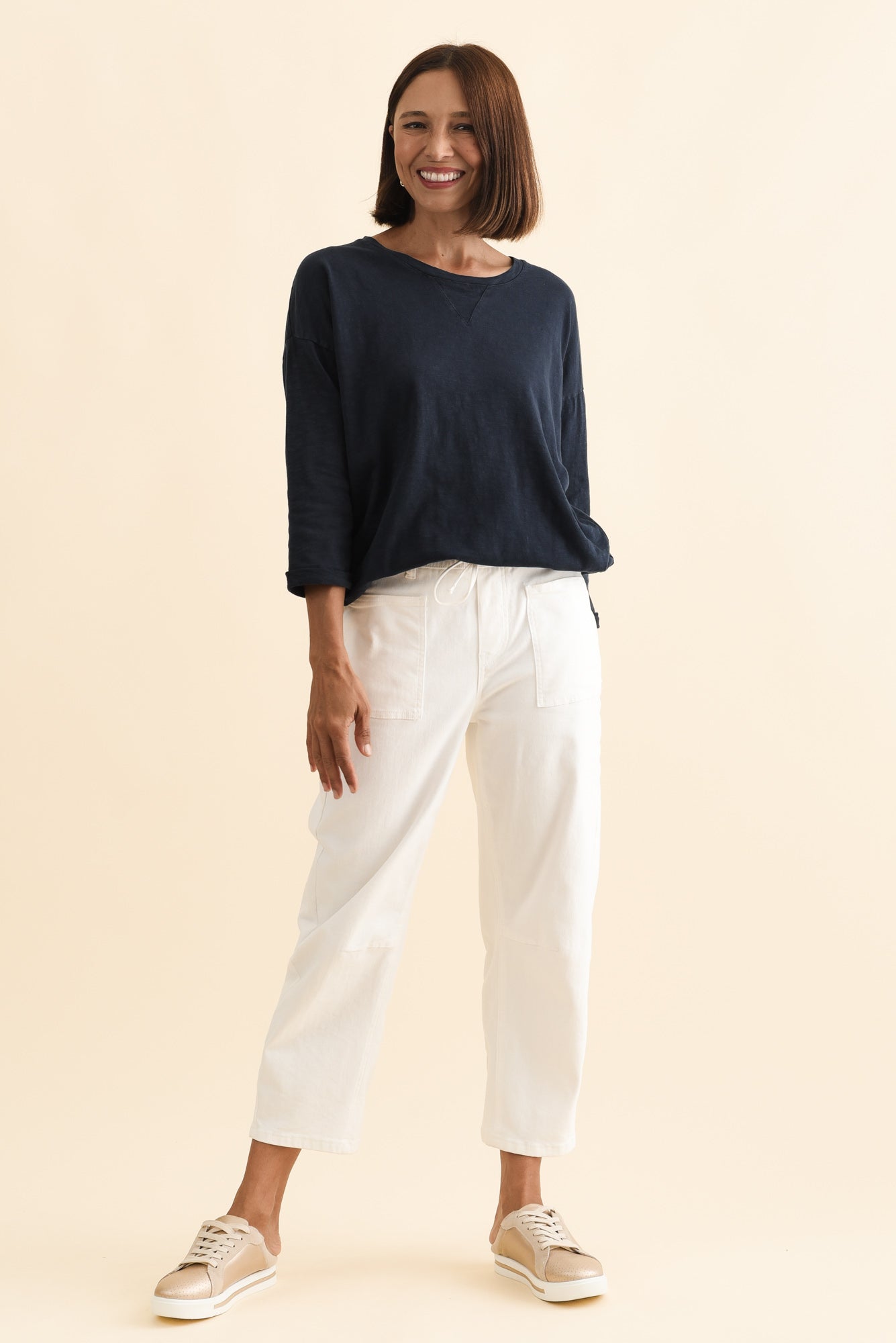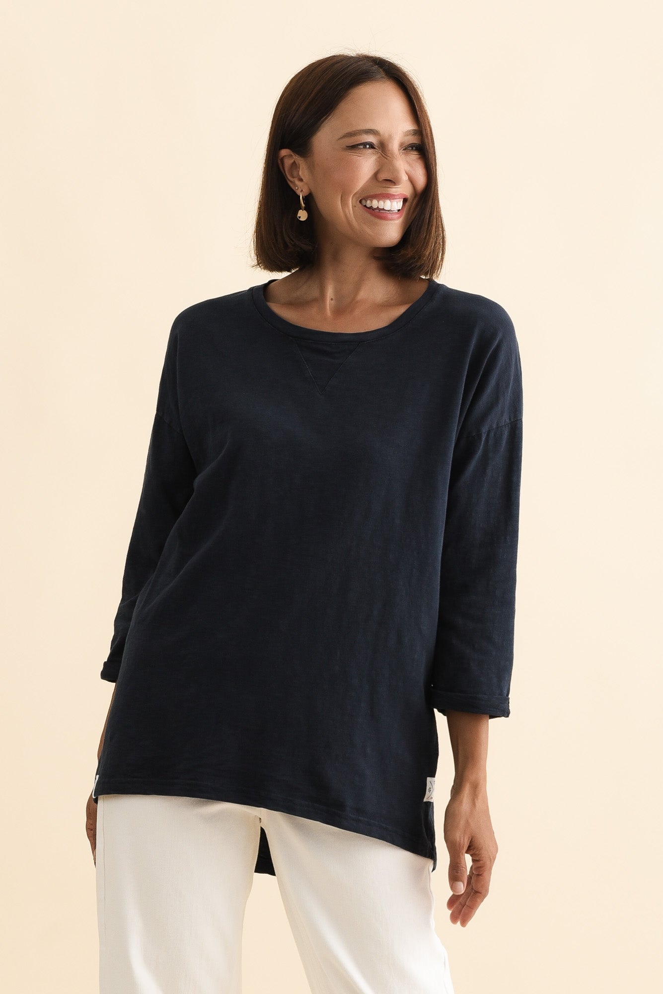 Relaxed-fitting 3/4 length sleeves feature small cuffs