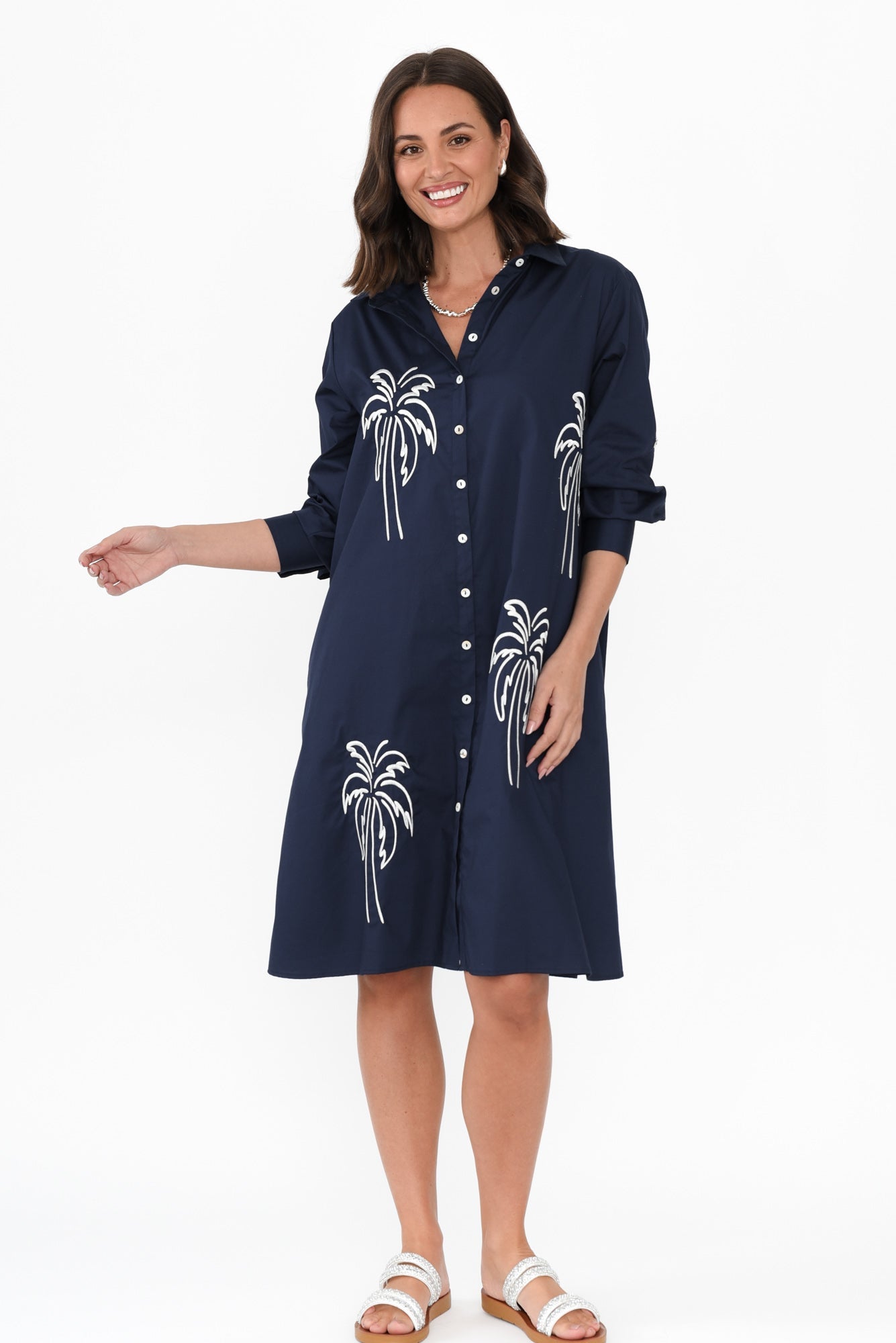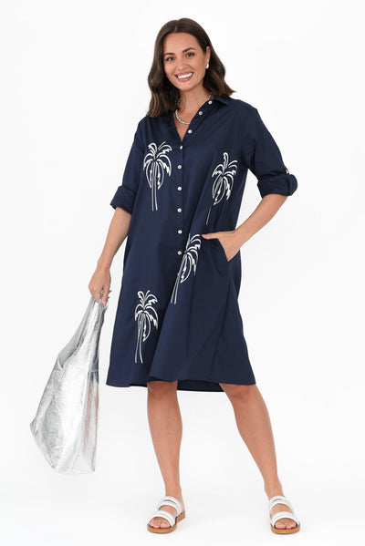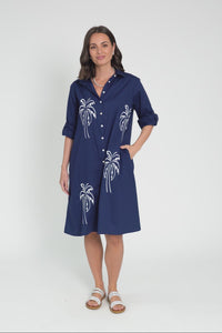 BRIDIE NAVY PALM COTTON SHIRT DRESS
