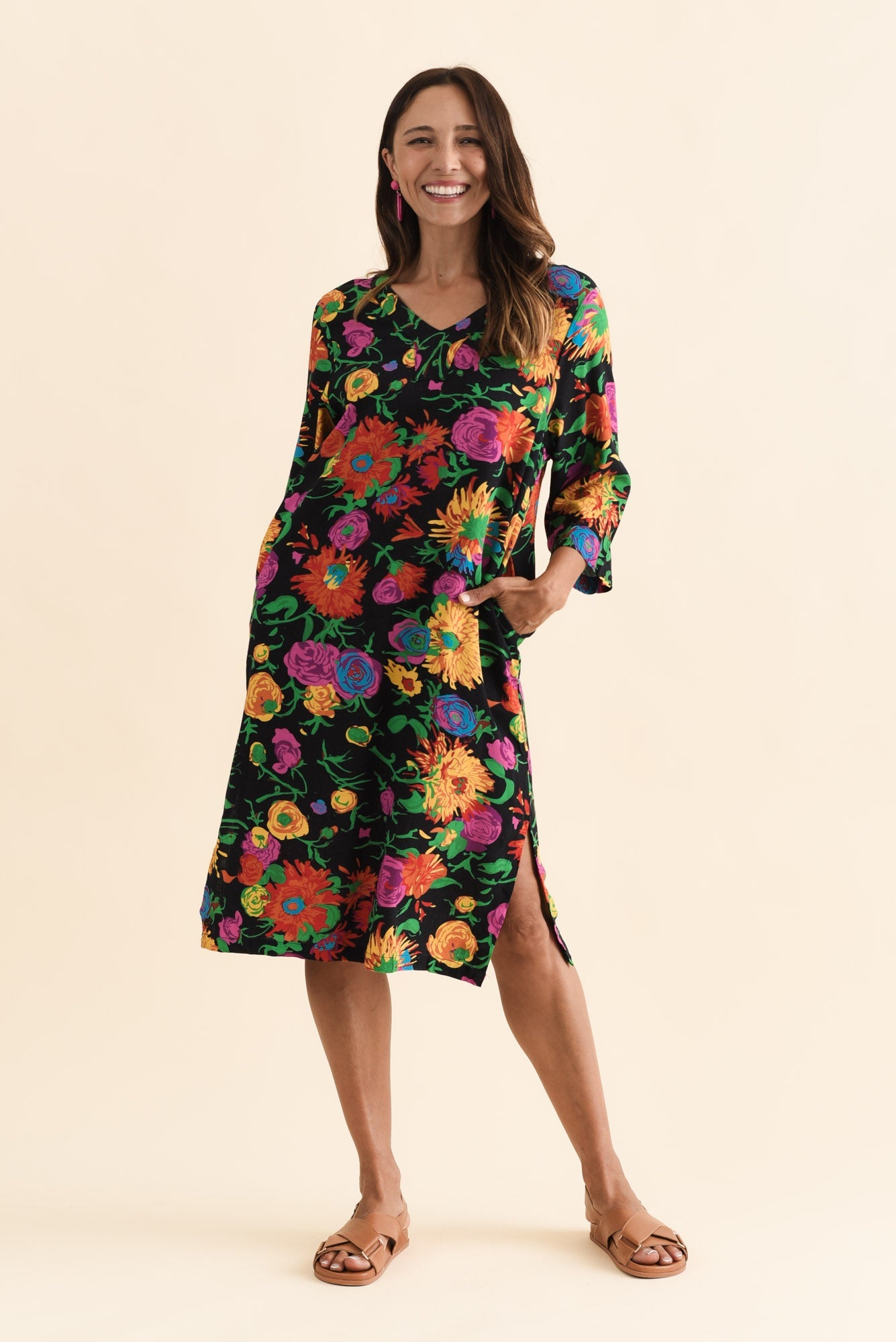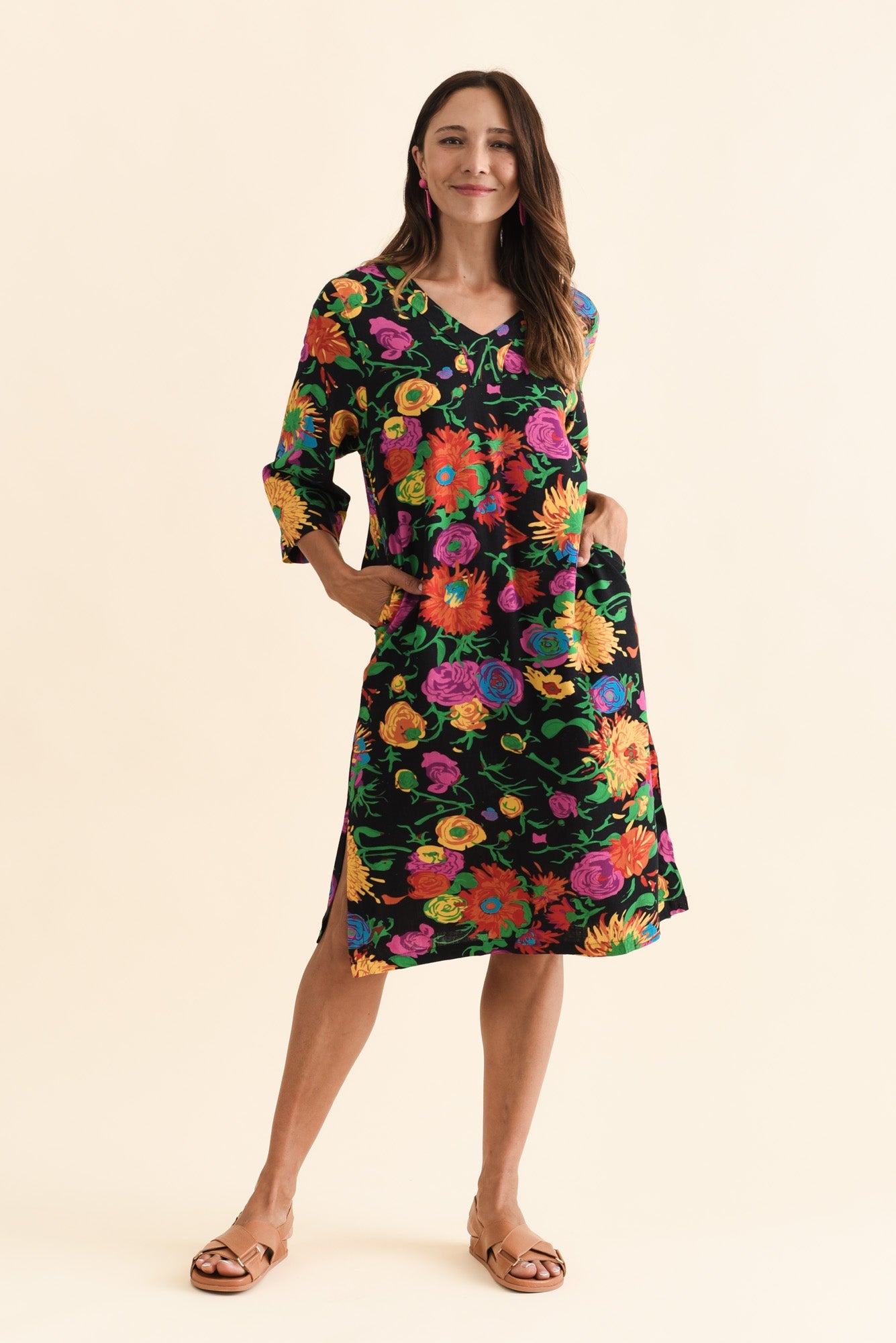 CELINE BLACK FLORAL LINEN COTTON DRESS