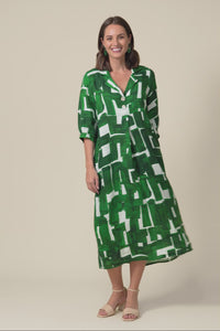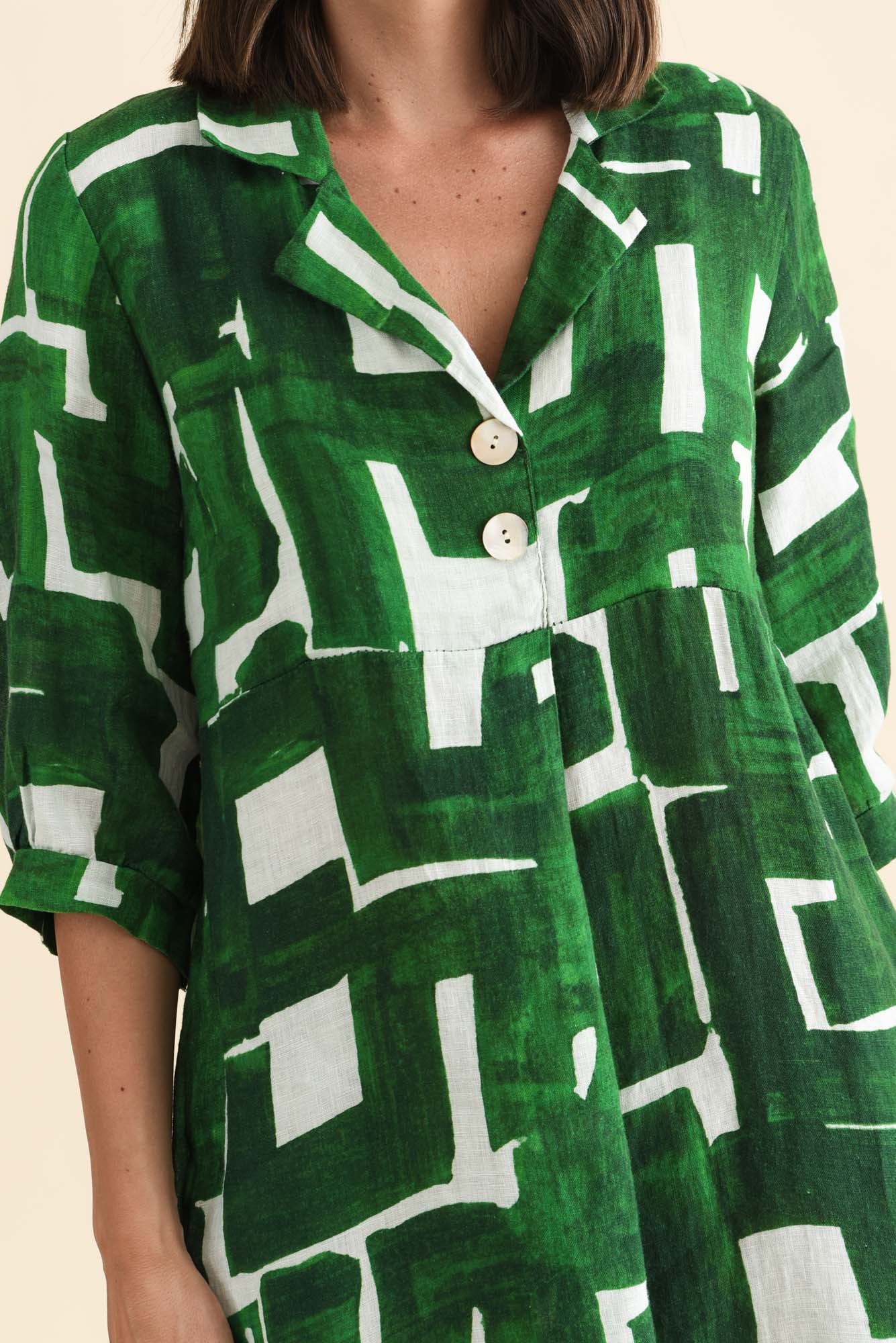 DARIA GREEN GEO LINEN COLLARED DRESS