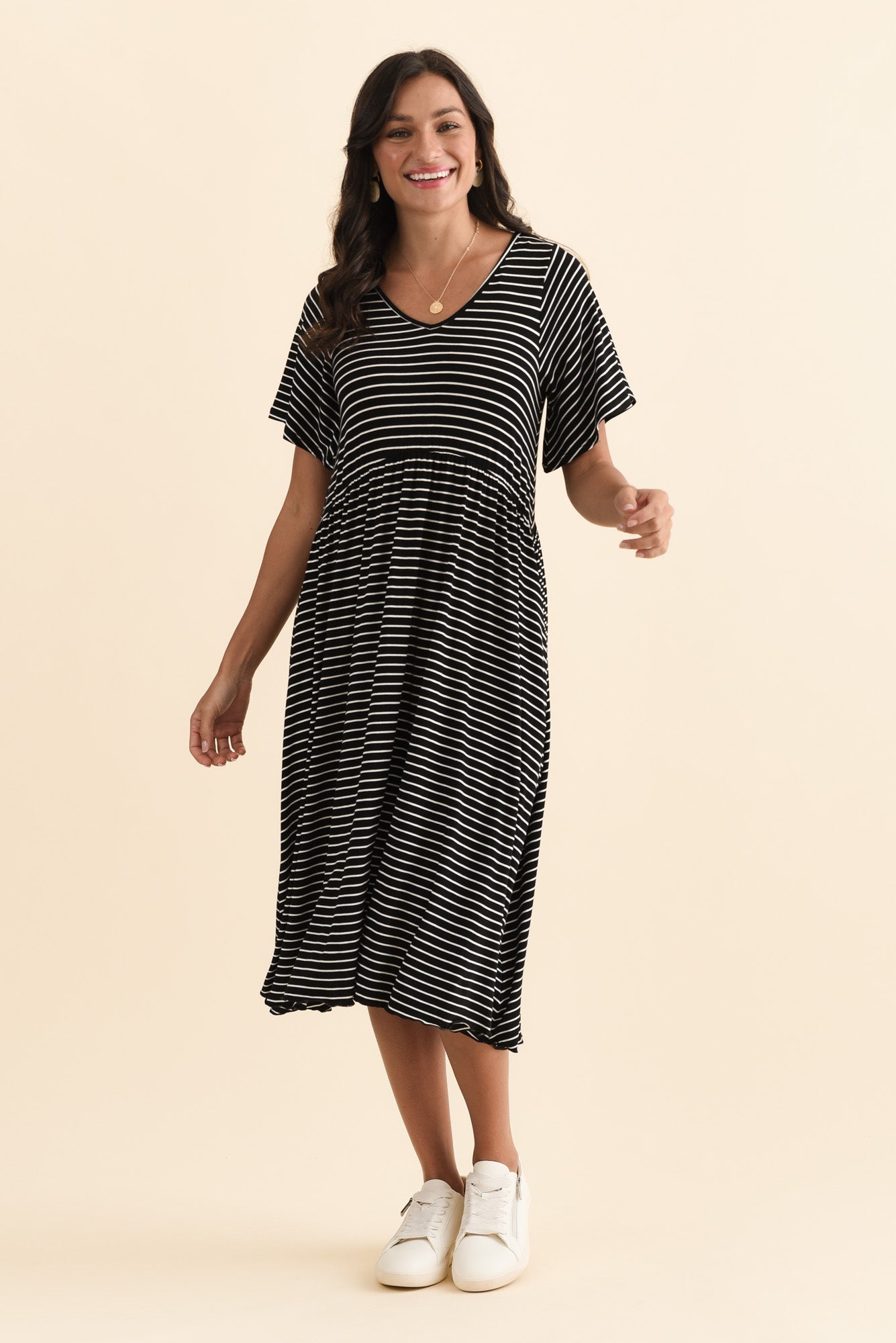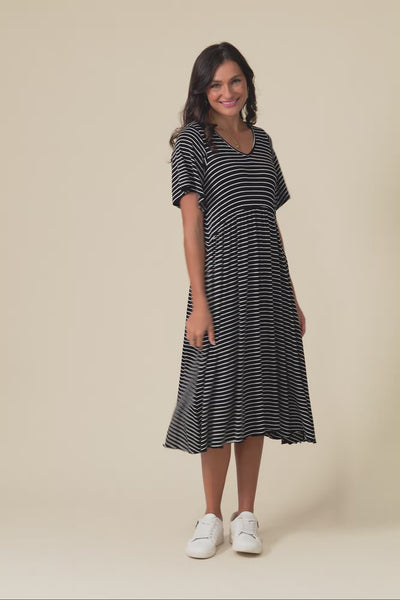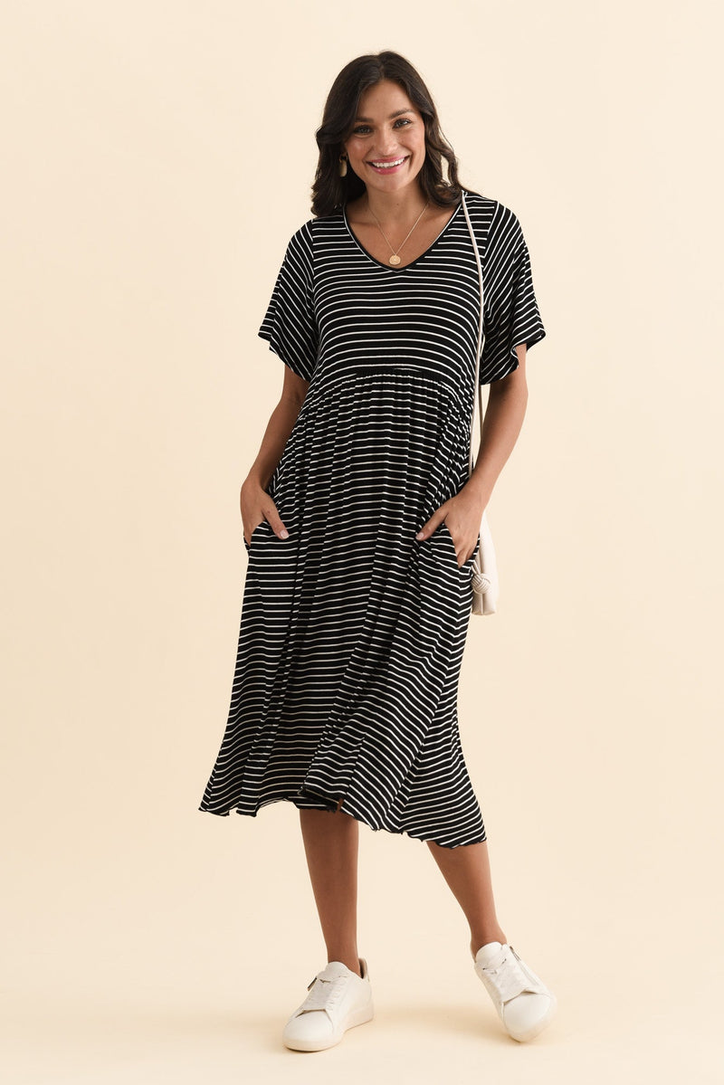 Donna Black Stripe Gathered Dress