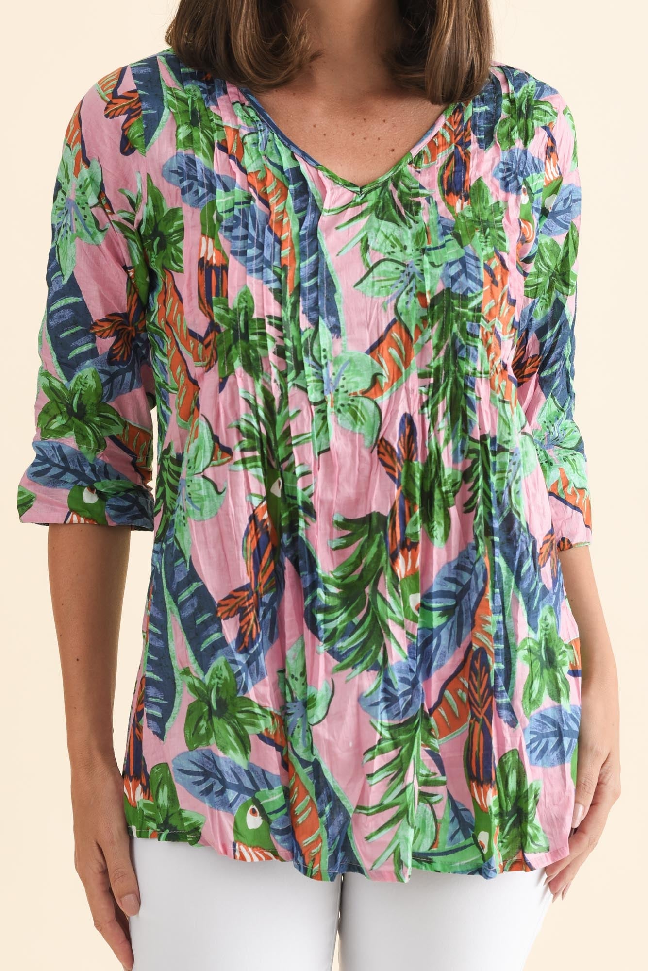 FIA PINK TROPICAL SLEEVED CRINKLE COTTON TOP