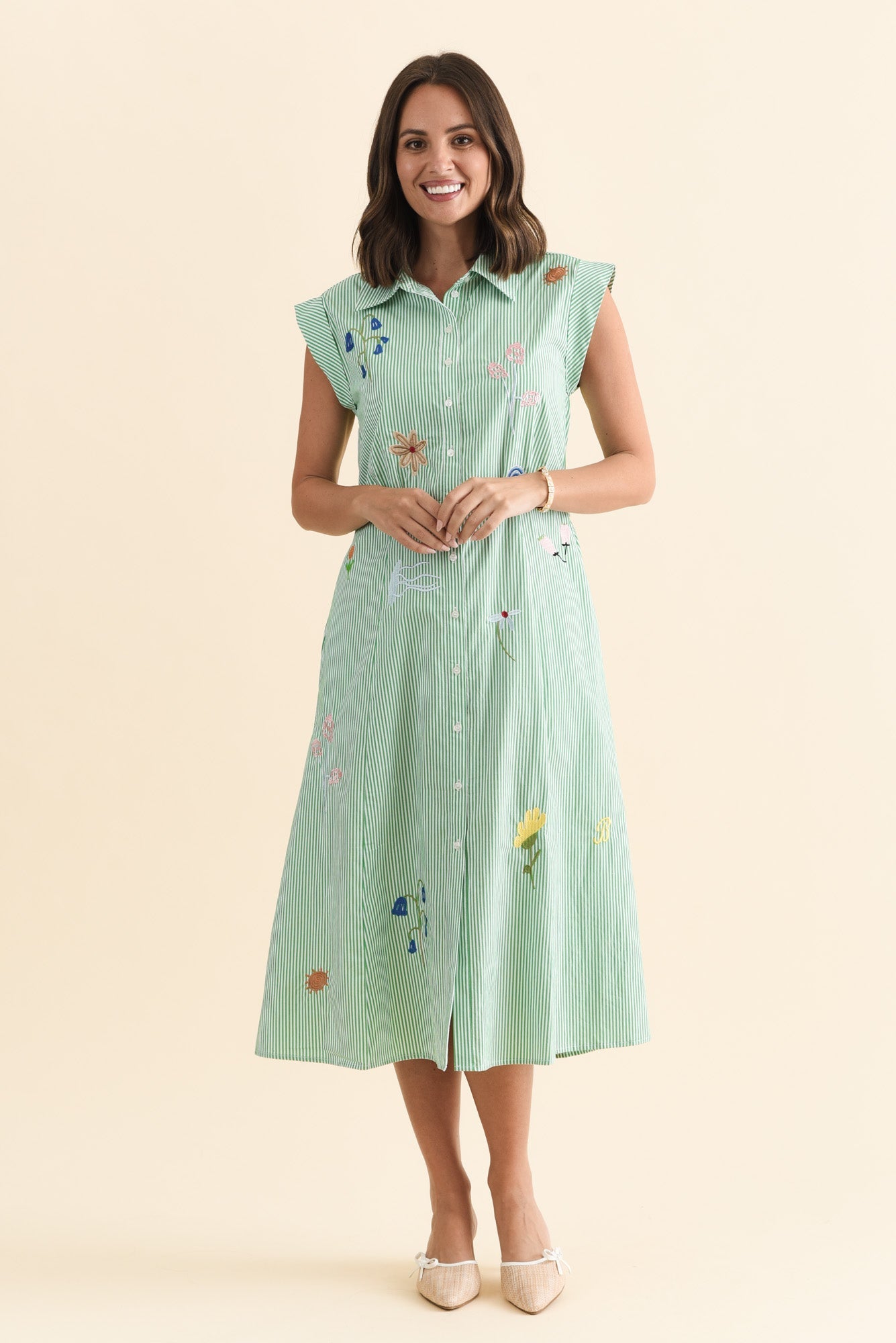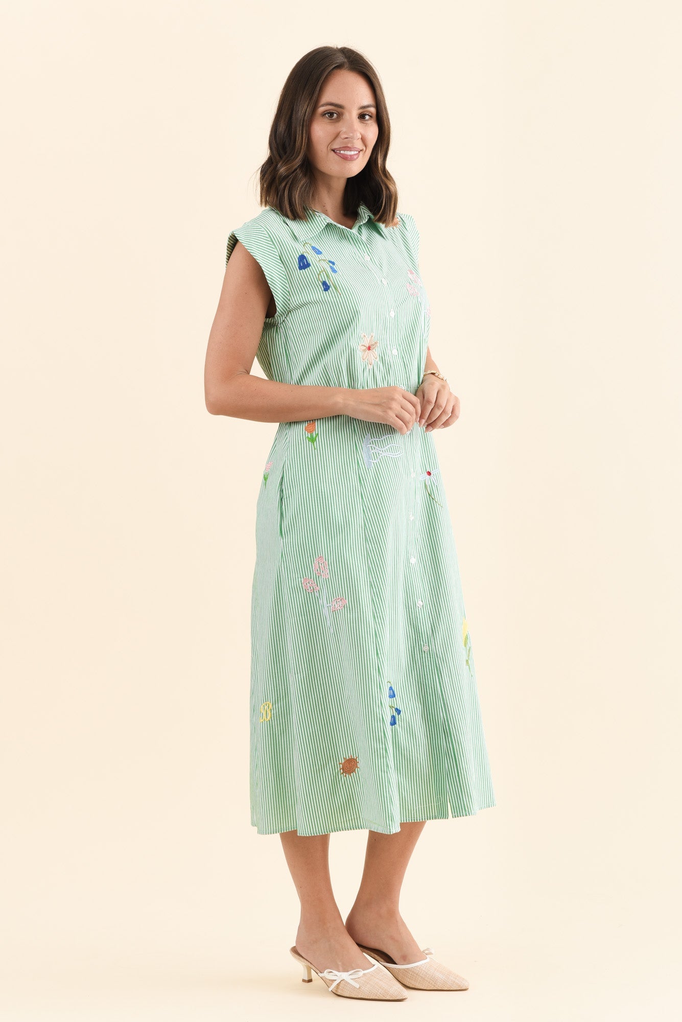 GLORIA GREEN STRIPE COTTON TIE DRESS