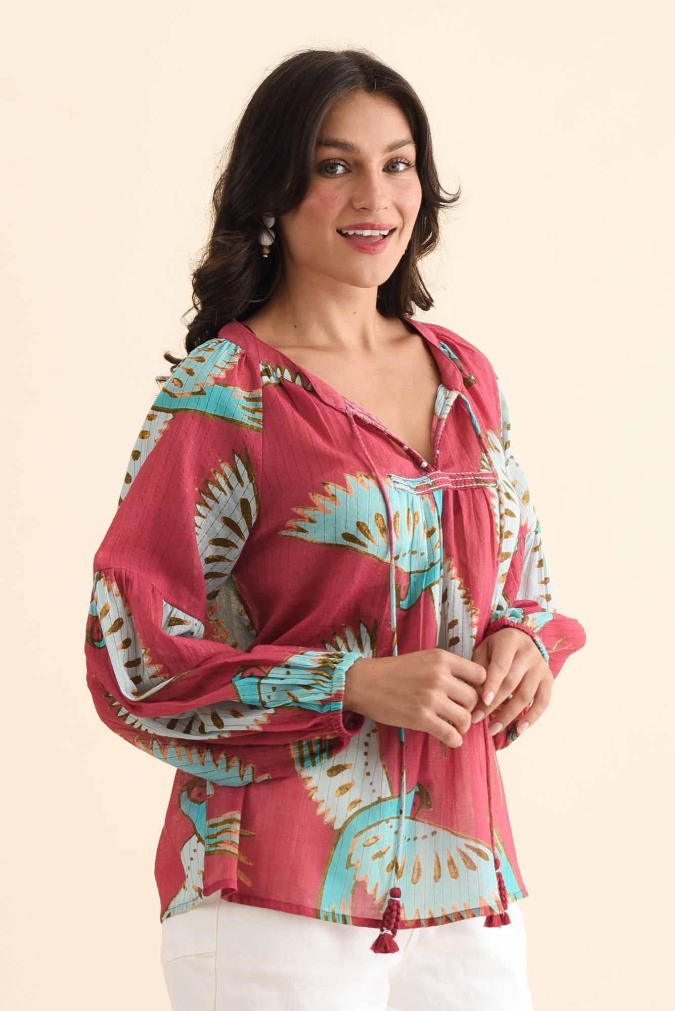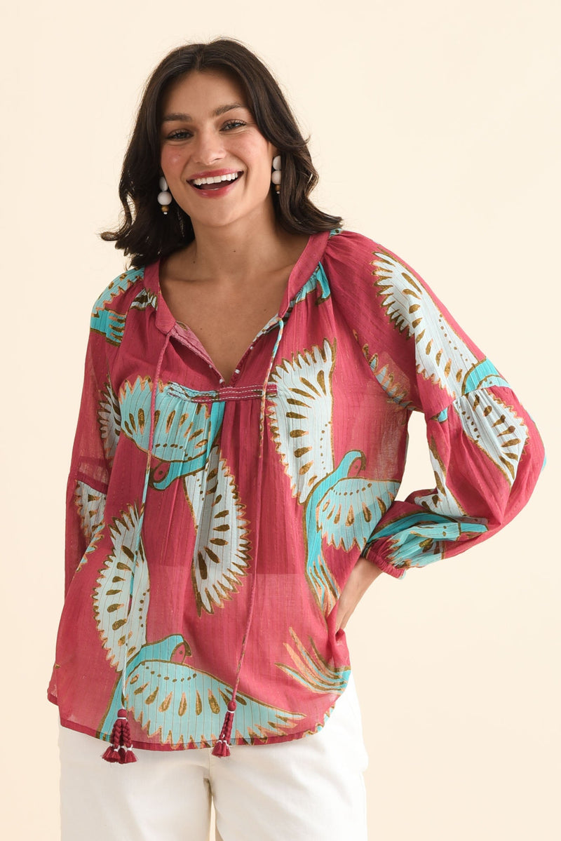 Lorrini Red Bird Cotton Tassel Top