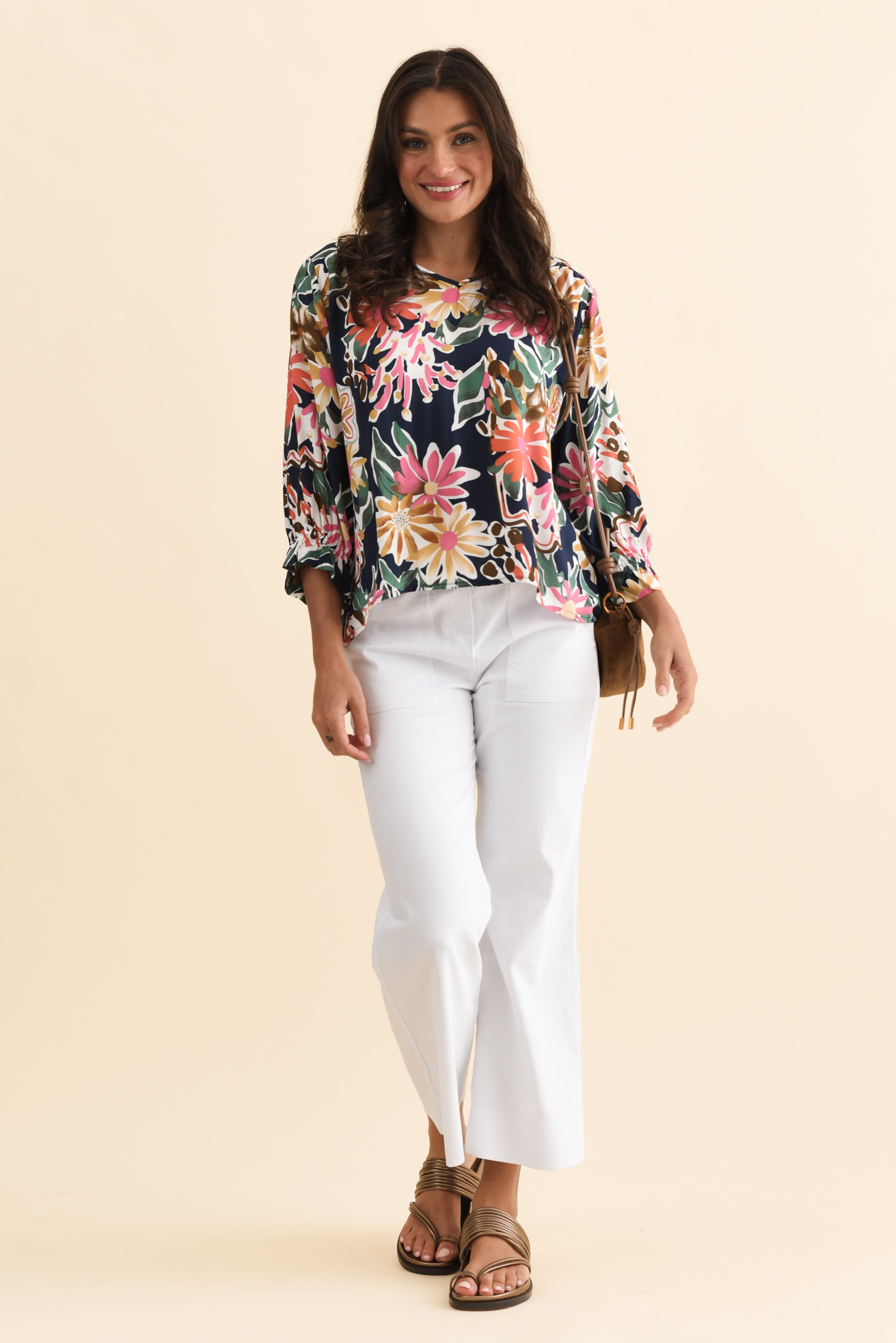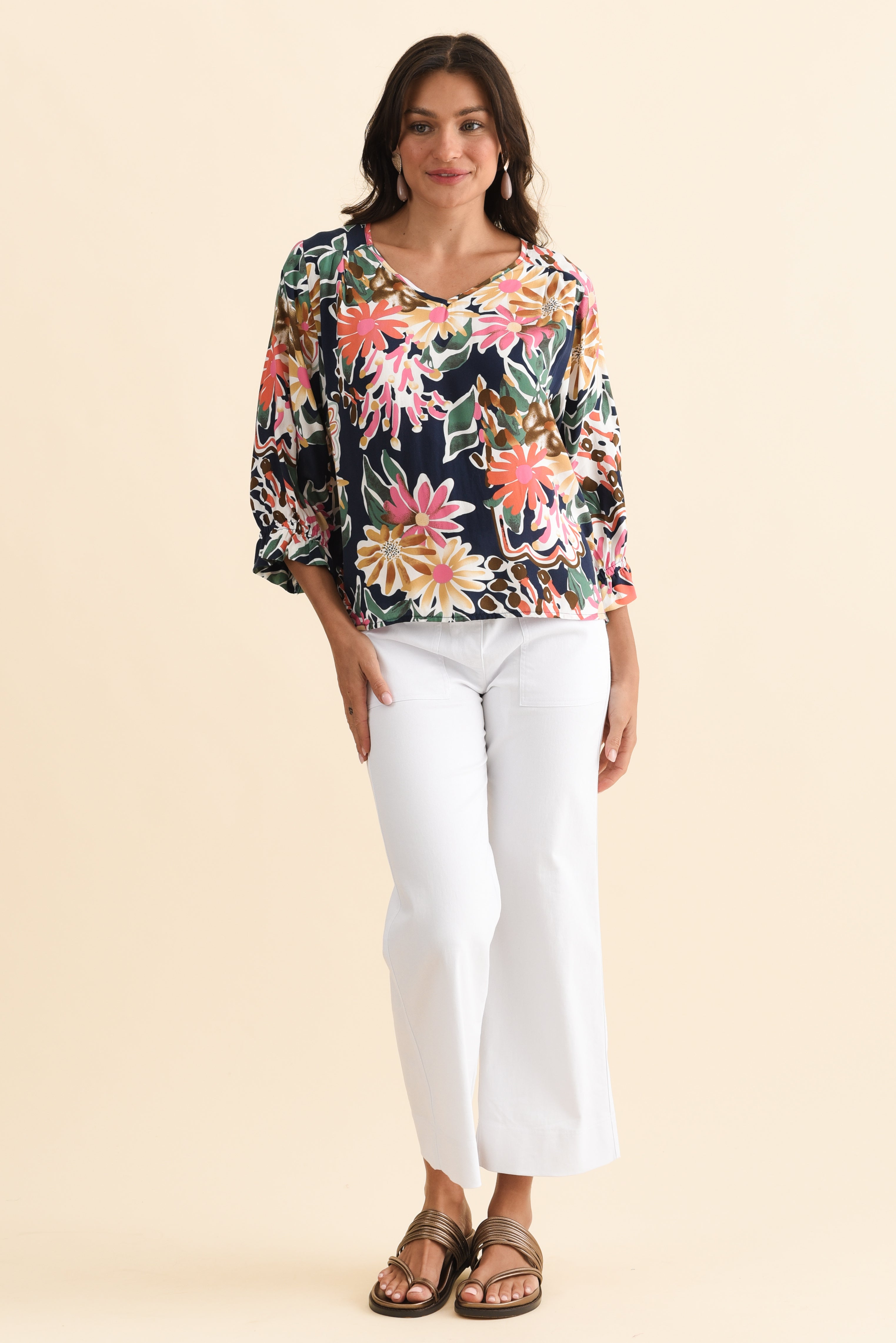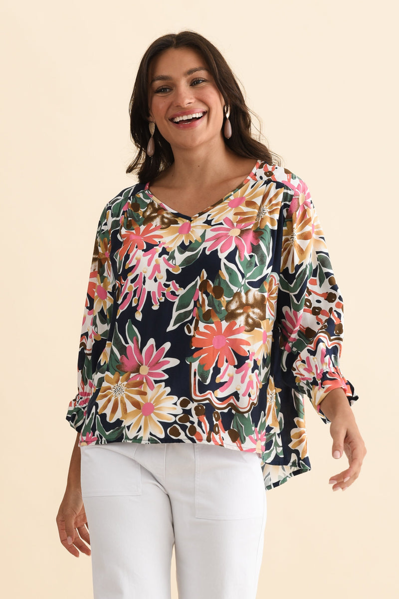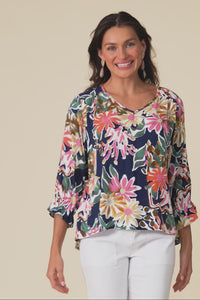Lourdes Navy Floral Frill Sleeve Top