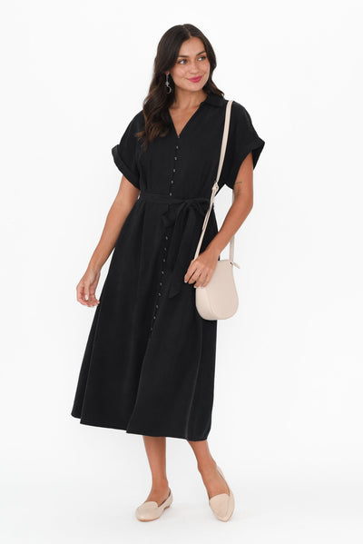 LUCIA BLACK LINEN BLEND BELTED DRESS