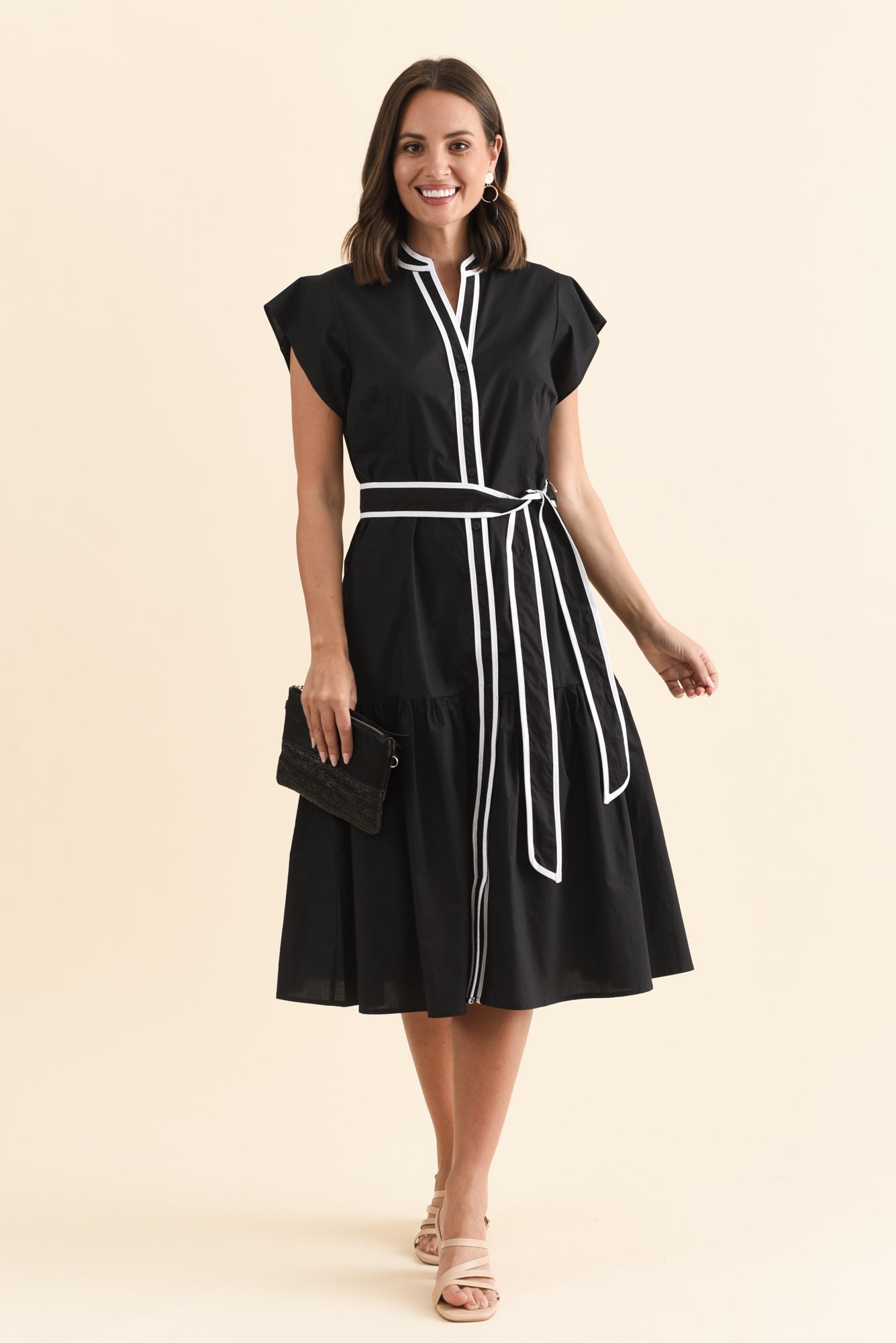 Detachable waist tie and convenient hip pockets complete this graceful look