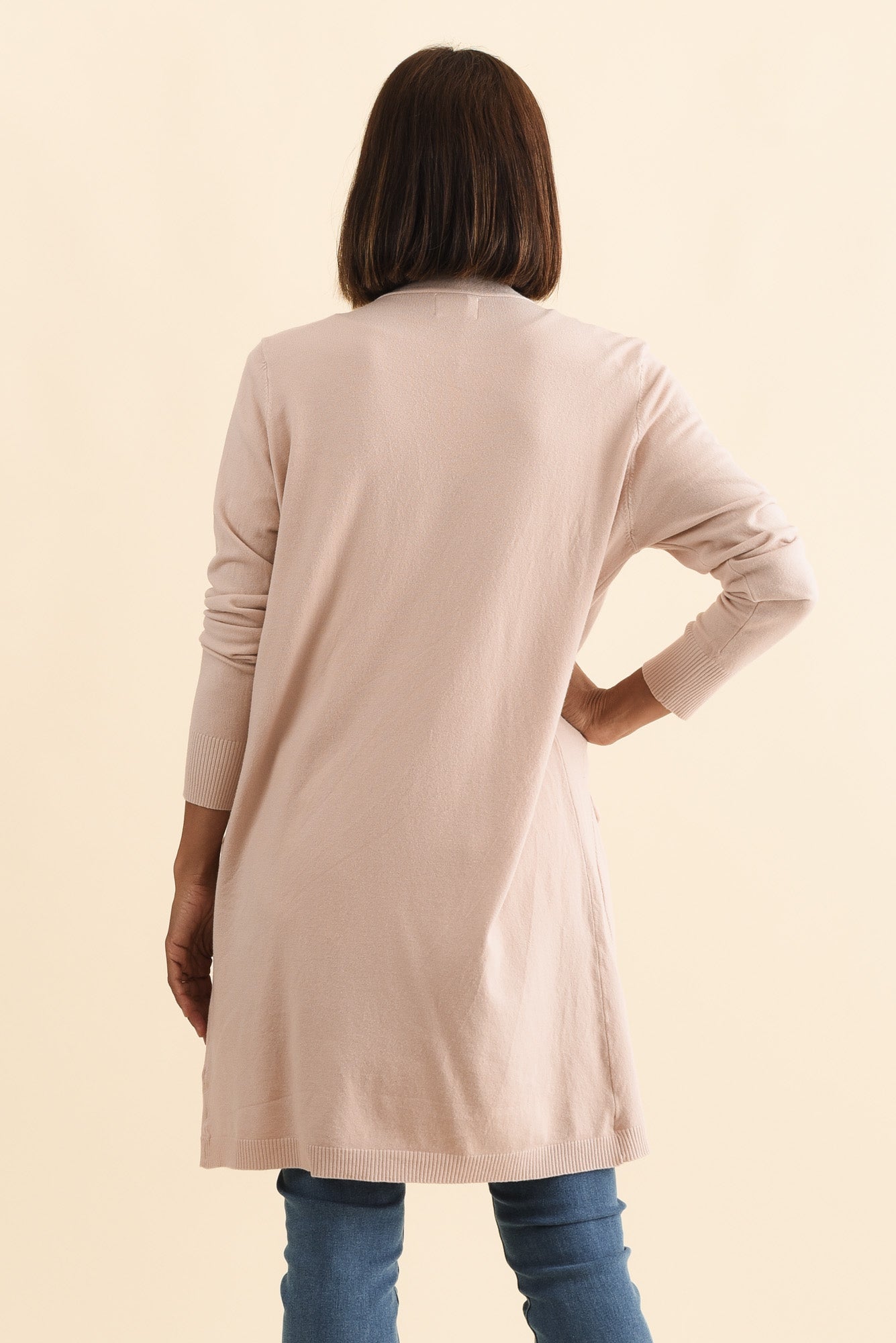 - Collarless, open-front design offers effortless layering