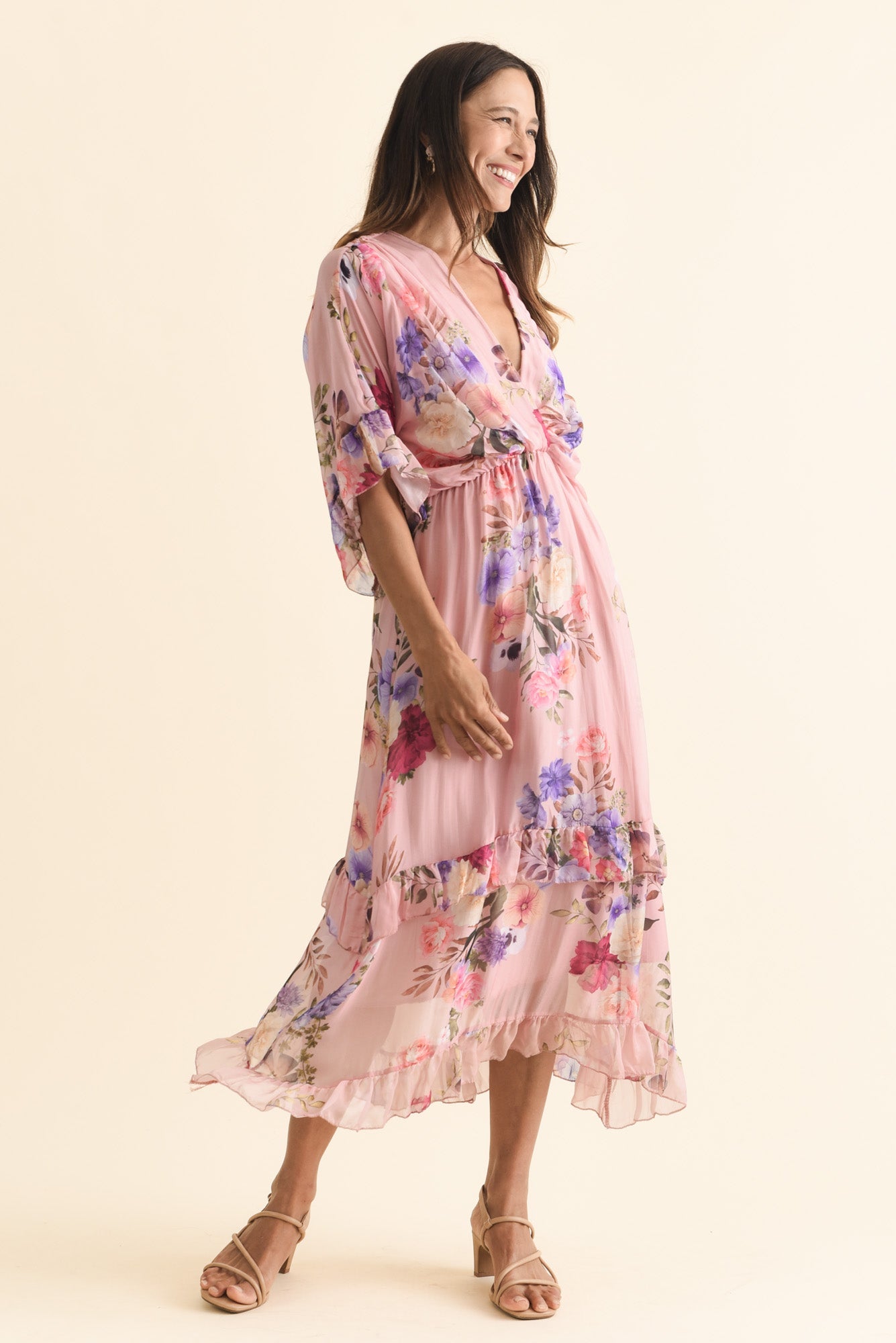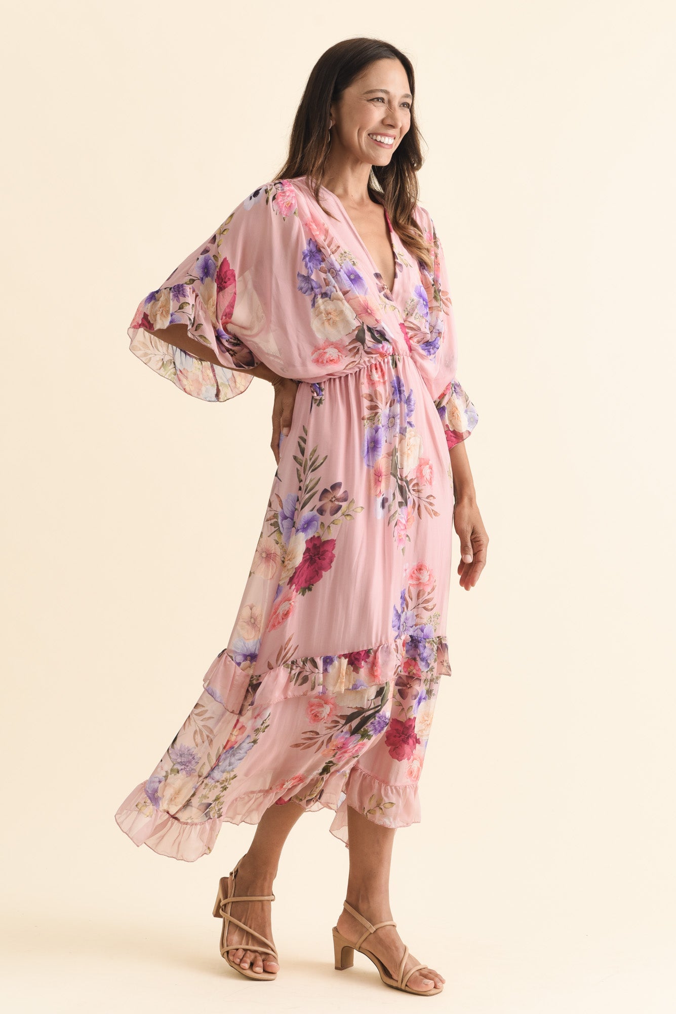 MINO PINK FLORAL SILK RUFFLE DRESS