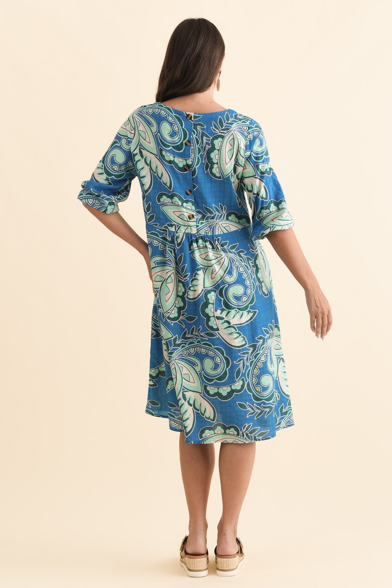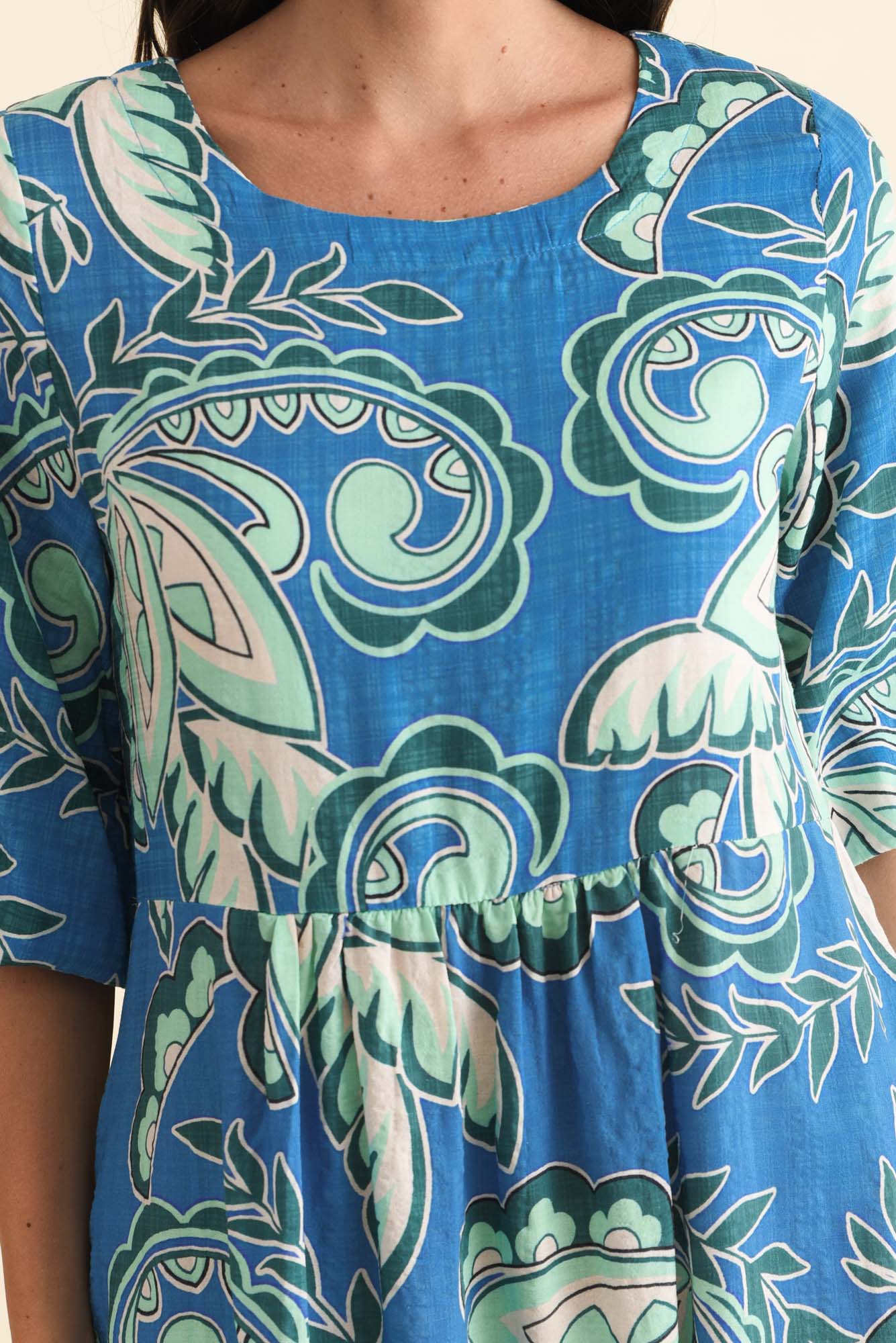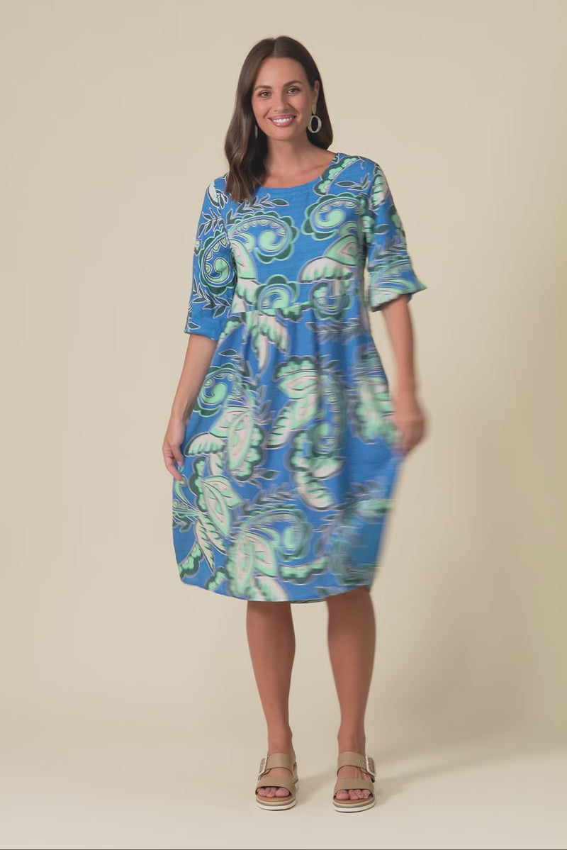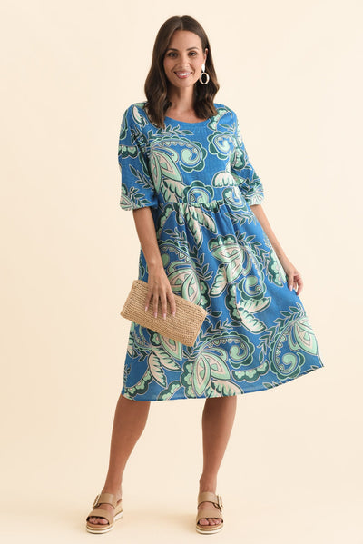 Nicolette Blue Paisley Cotton Blend Sleeved Dress