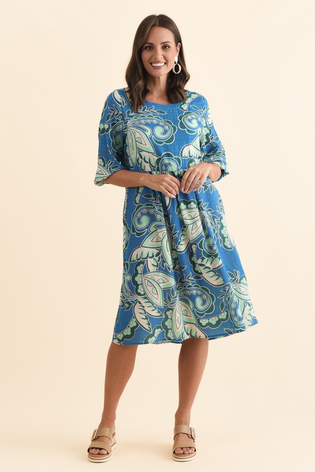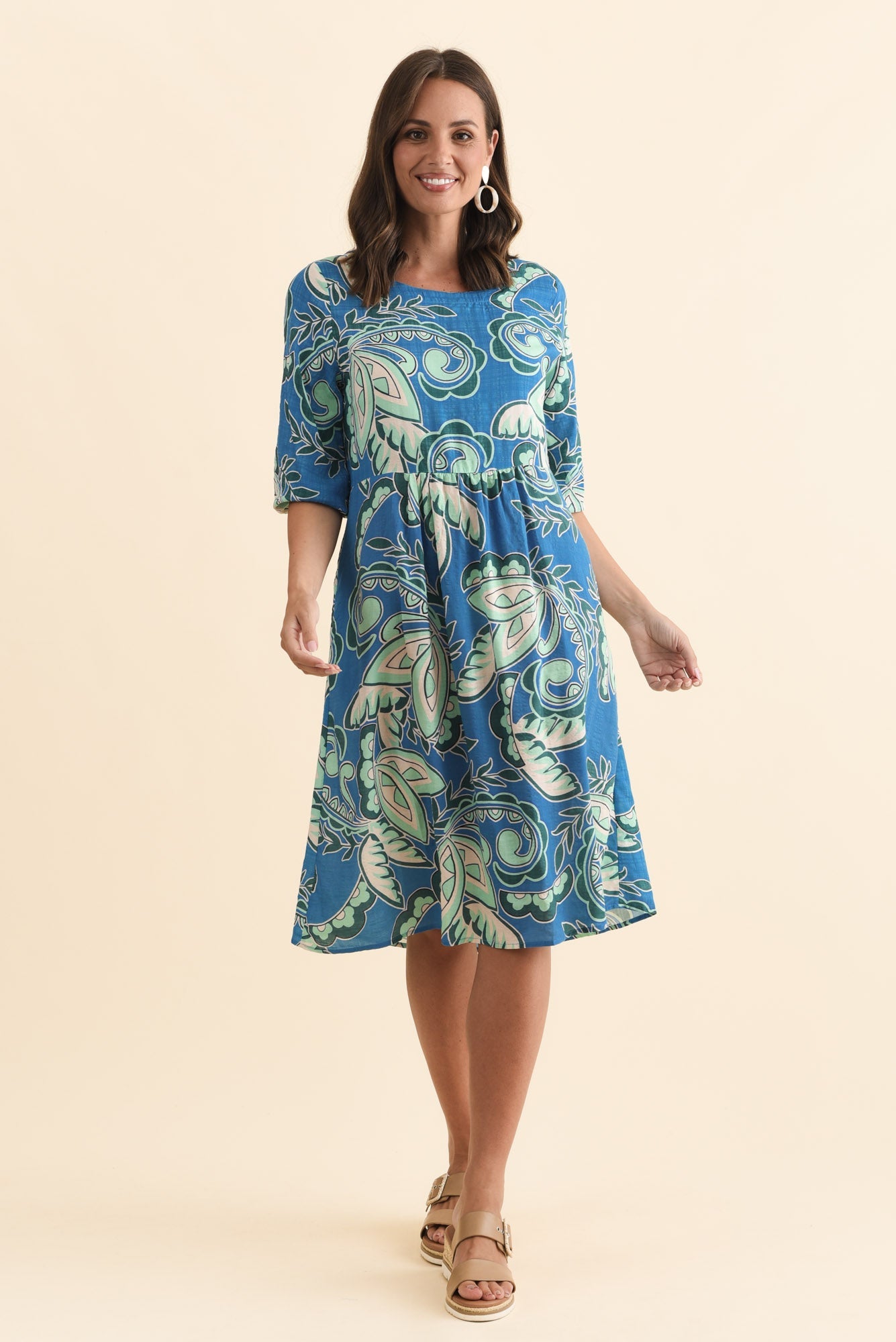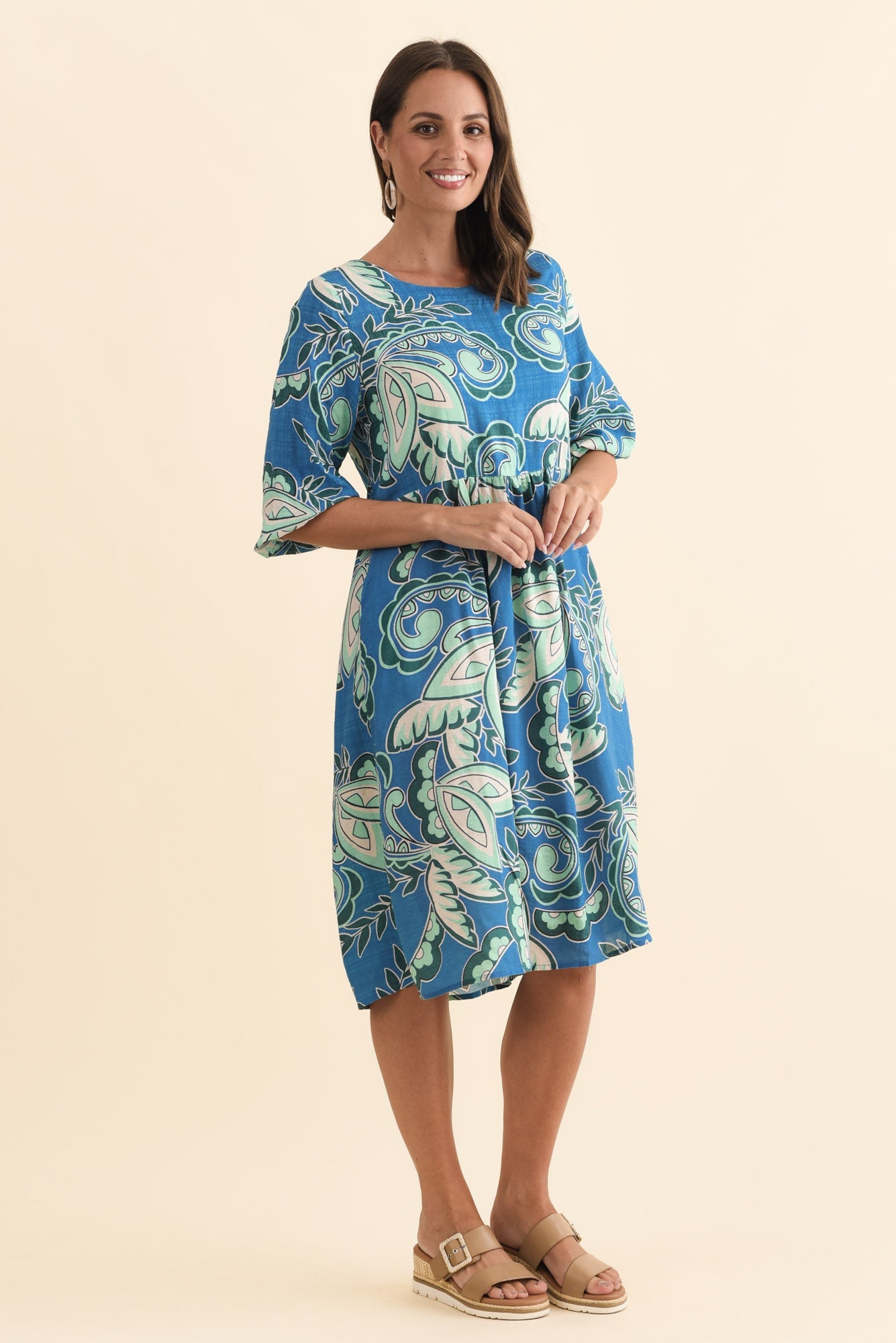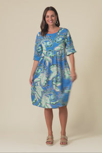 Nicolette Blue Paisley Cotton Blend Sleeved Dress