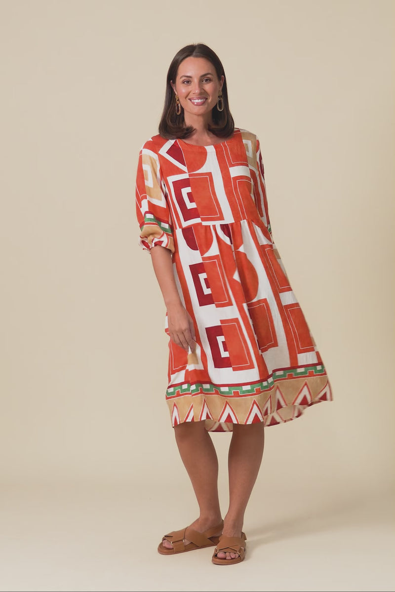 Nicolette Orange Geo Cotton Blend Sleeved Dress