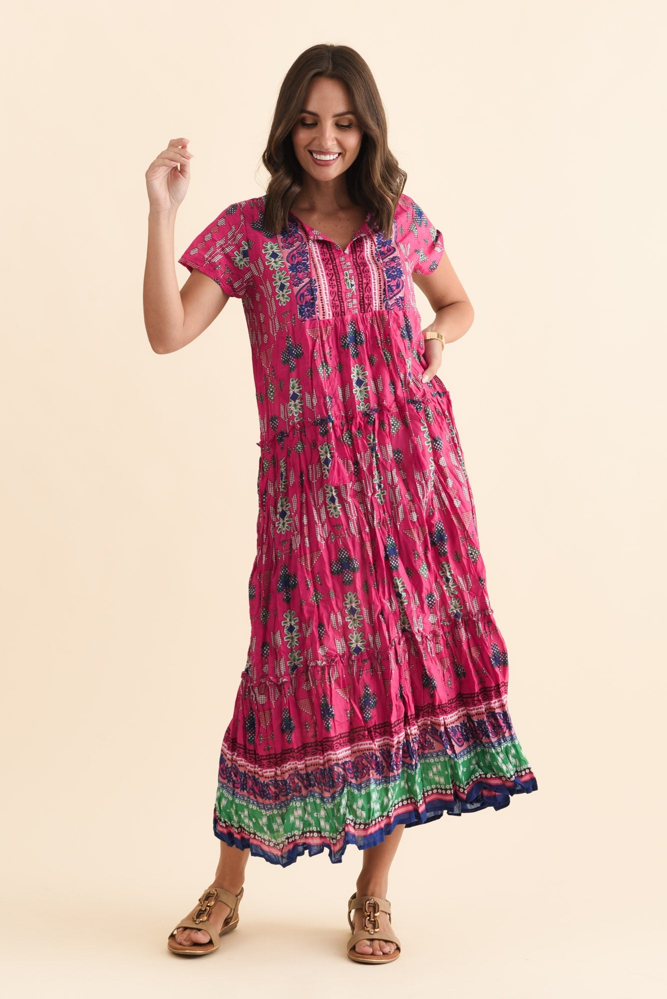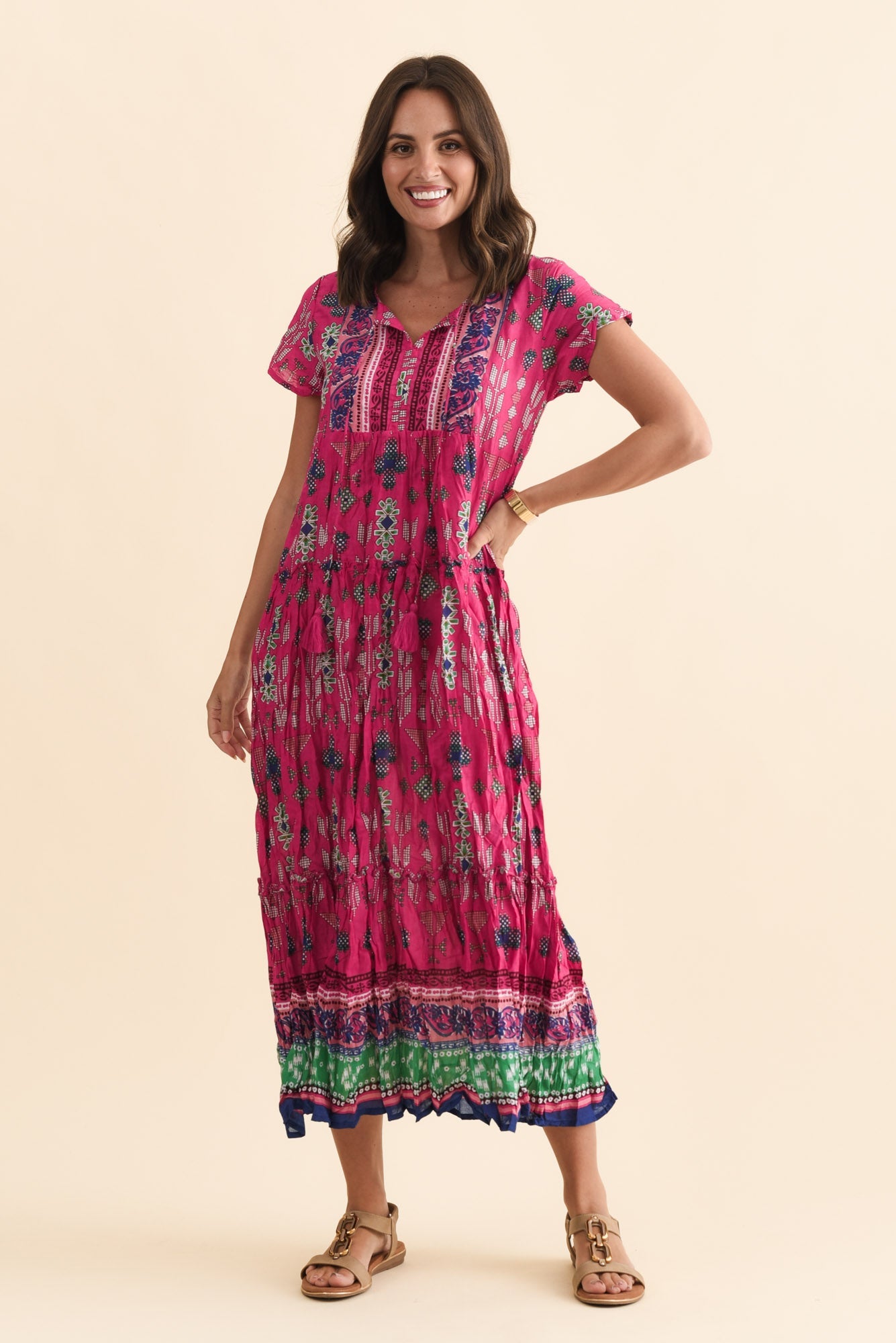 Nona Fuchsia Mosaic Crinkle Cotton Maxi Dress