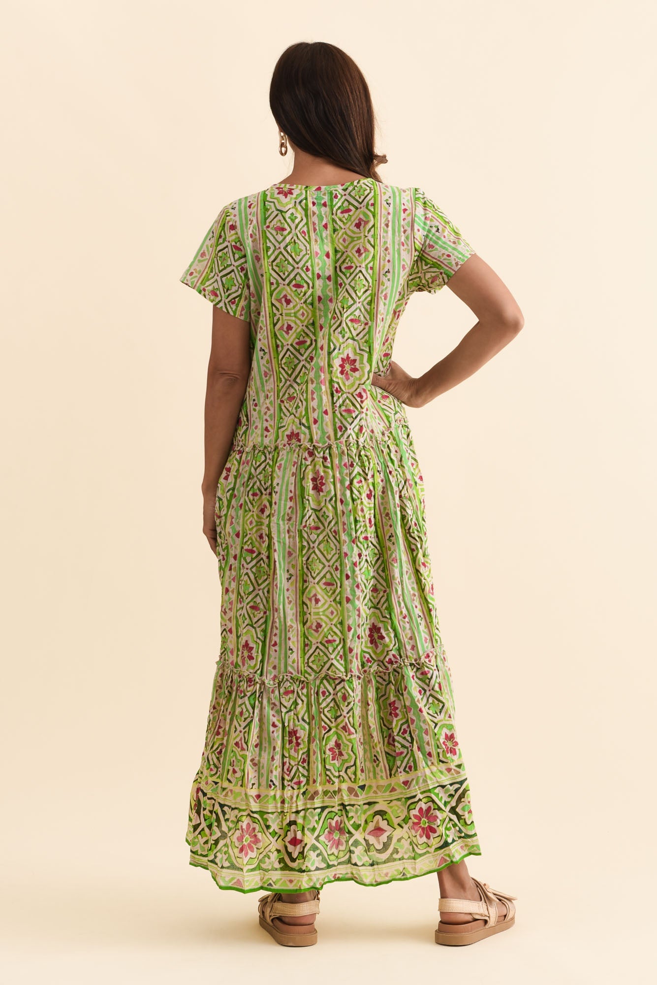 Nona Green Abstract Crinkle Cotton Maxi Dress