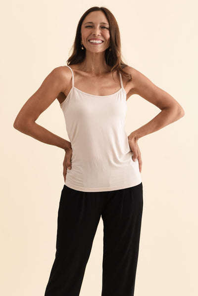Closet-staple slip cami in a lightweight, breathable bamboo featuring a soft hand feel and stretchy finish