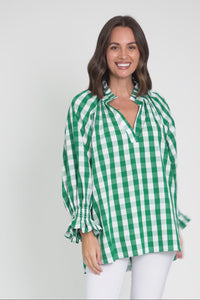 Olena Green Check Cotton Puff Sleeve Blouse