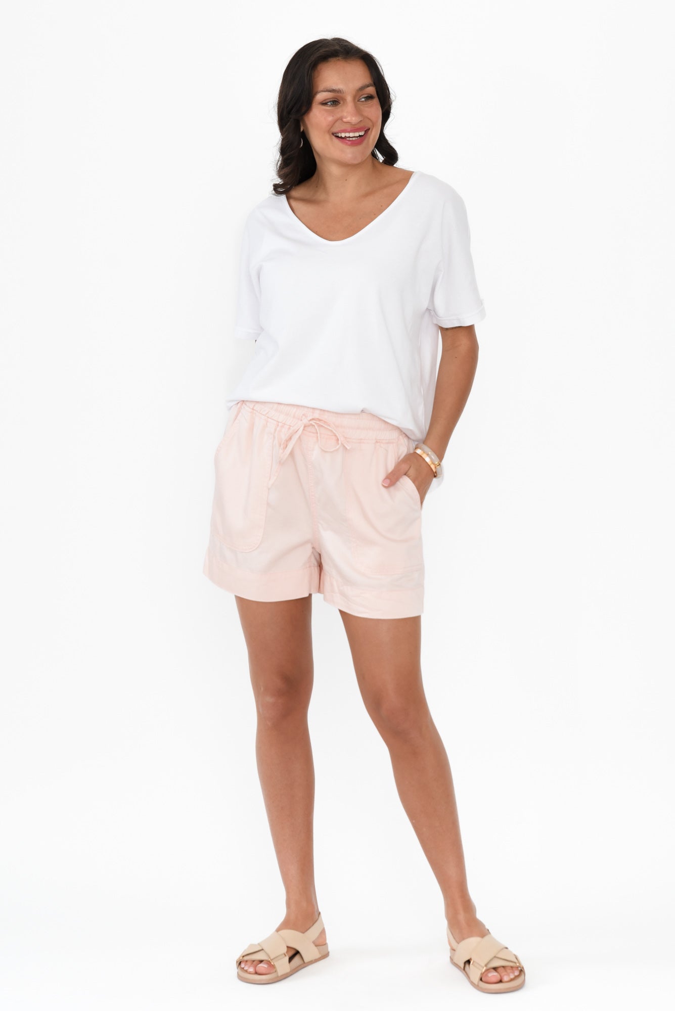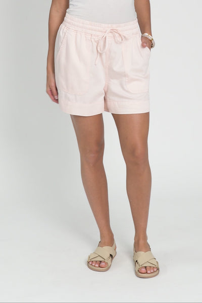 A chic, lightweight denim short in a feminine blush shade, showcasing a denim look and feel