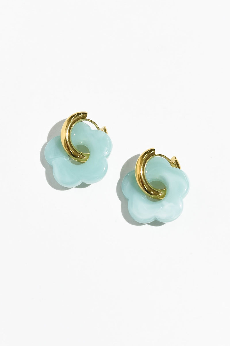 These gold hoop earrings feature a detachable blue acrylic flower, offering a refreshing twist to the classic hoop.