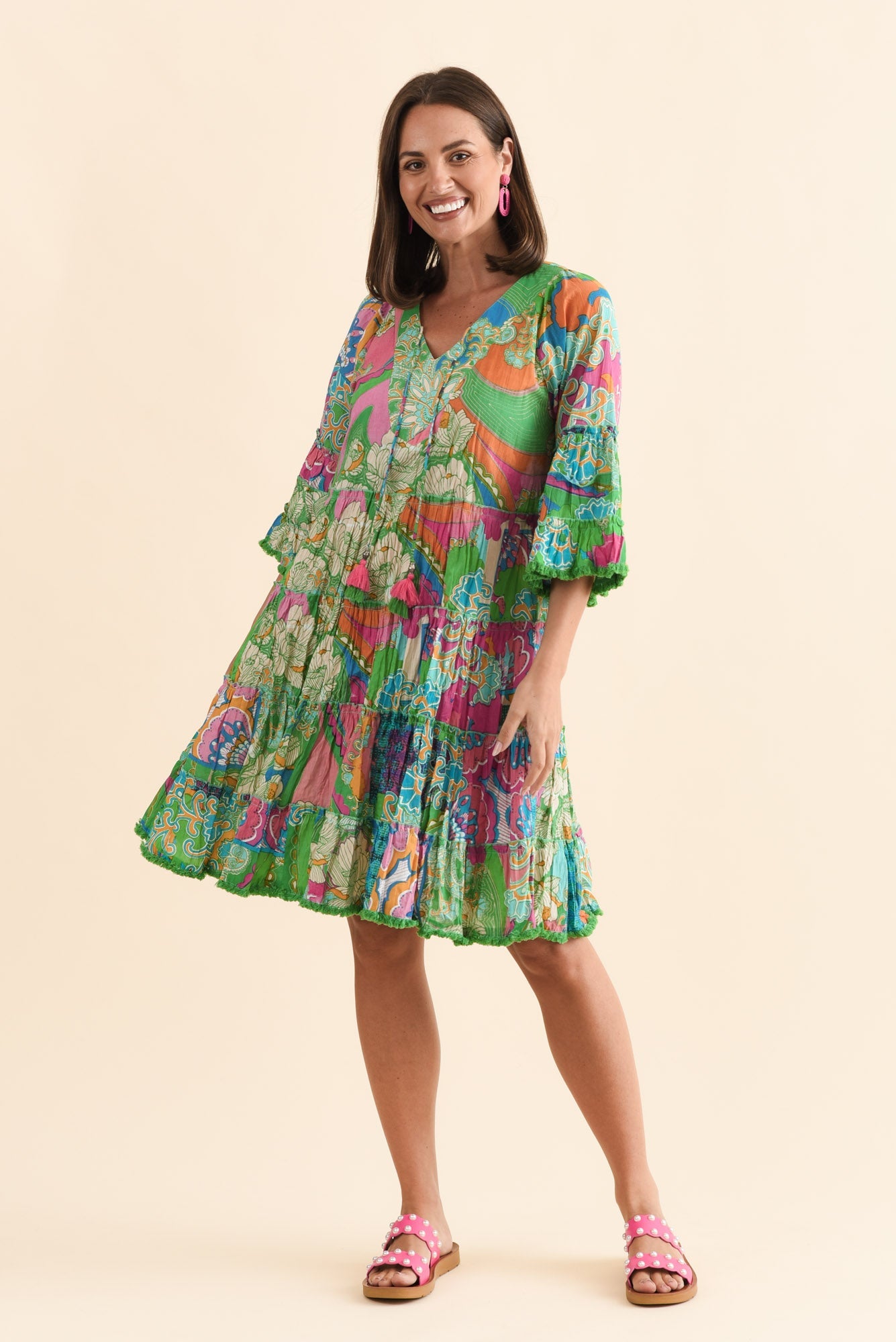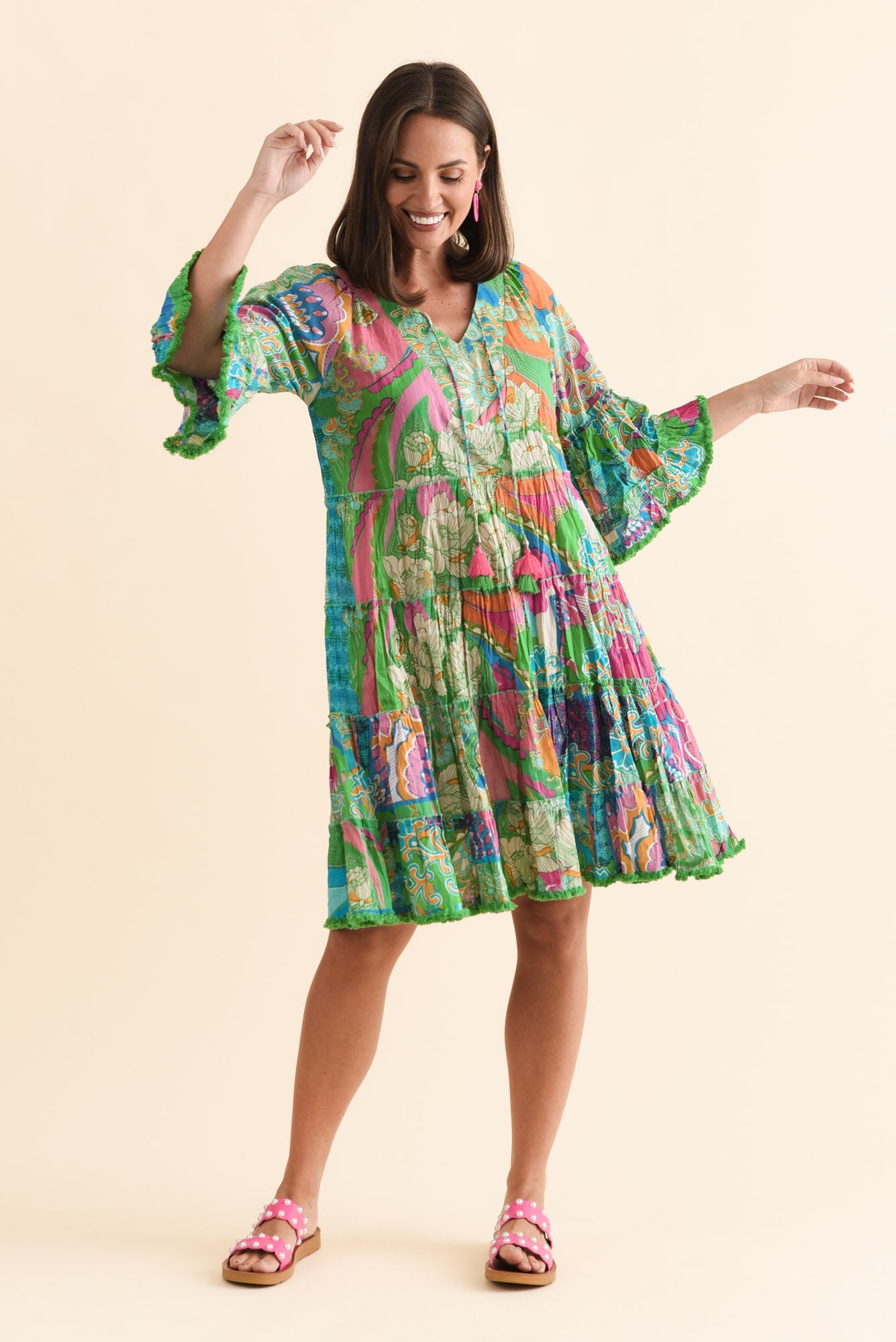 STEVIE GREEN MOSAIC COTTON TASSEL DRESS