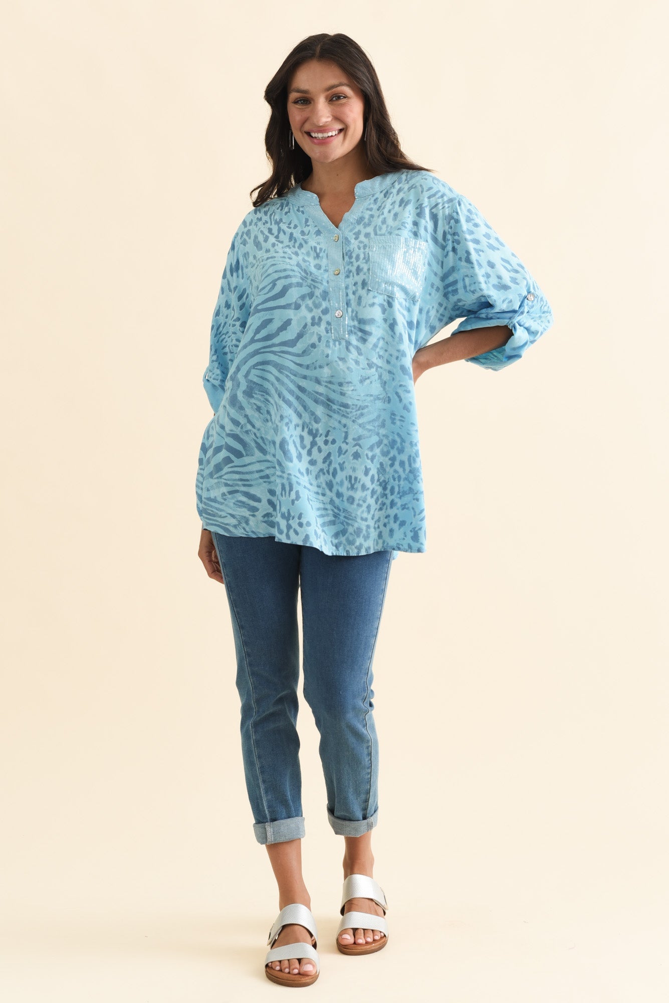 TARYN BLUE ANIMAL COTTON BUTTON TOP
