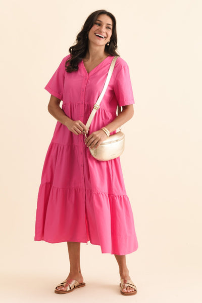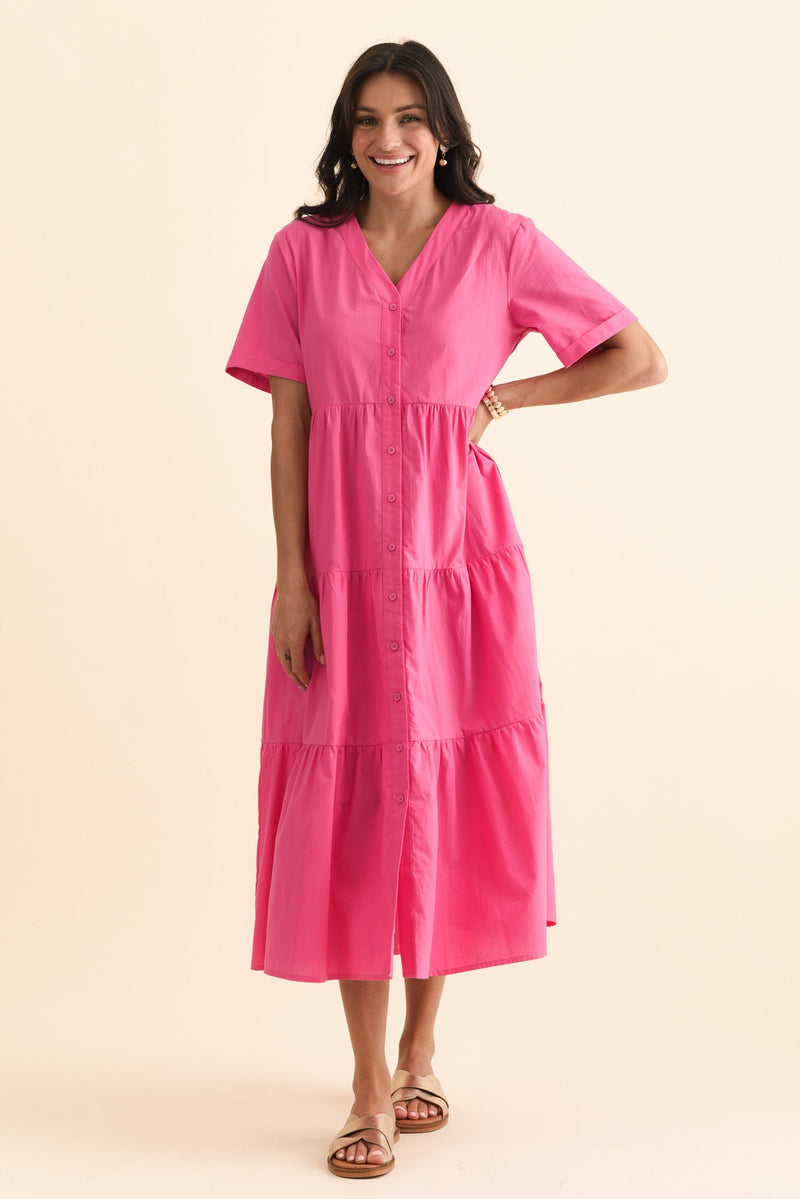 A-line silhouette is accentuated by a feminine tiered skirt design